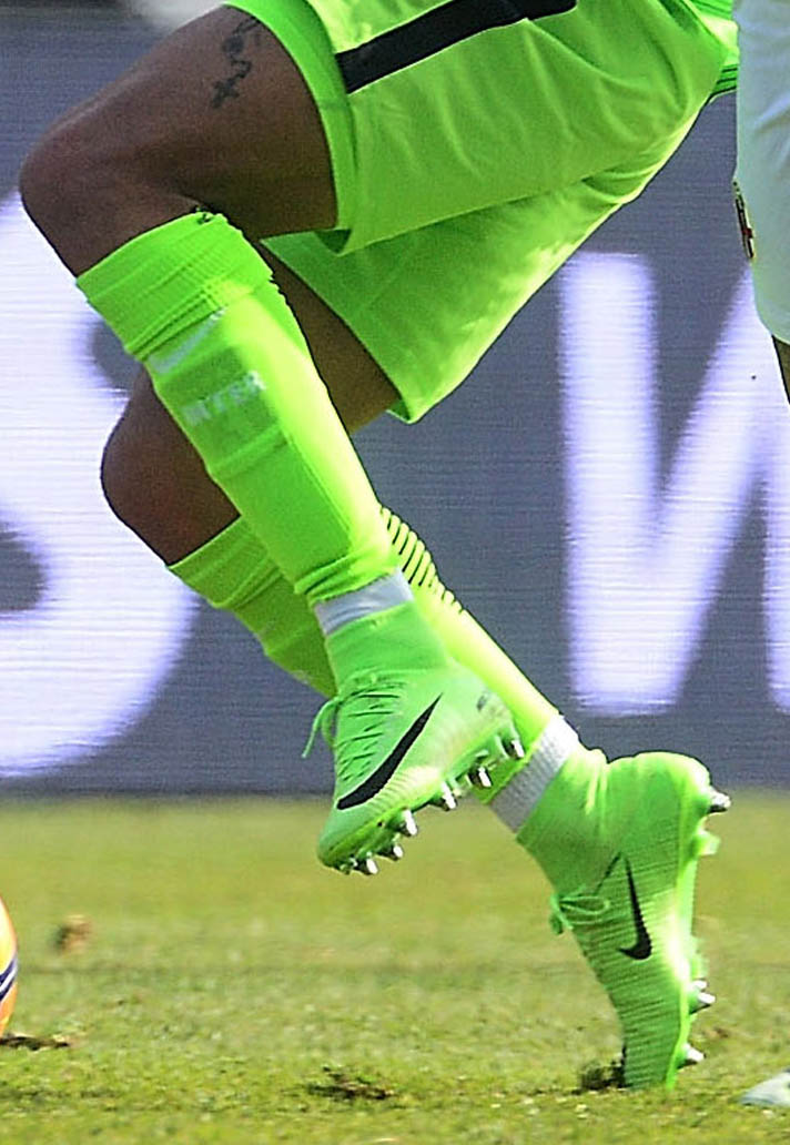 Inter Milan were forced into their third kit this week as they travelled to Bologna. Holding a visually stunning display of colour, the third strip hasn't seen much game time but a timely introduction of the Nike Radiation Flare pack sees it flow effortlessly into the "Electric Green" Nike Mercurial Superfly V.