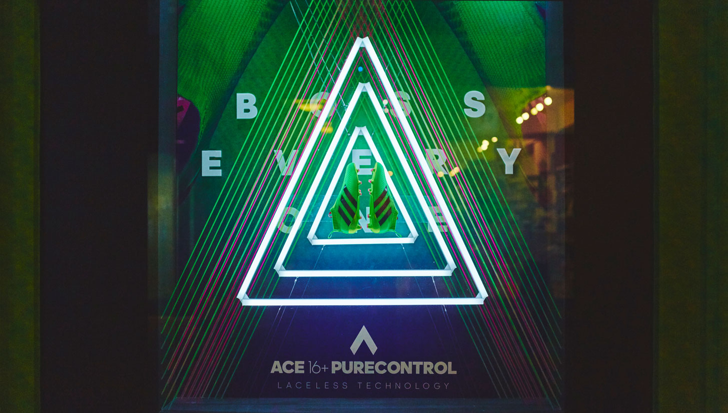Wall to wall with the new adidas ACE16 collection, it's a glowing celebration of the latest innovation from the labs championed by three stripes. A collaboration between Pro:Direct and adidas that has been installed and designed by Intermarketing Agency, it entwines the stripes onto a shop floor like no other.