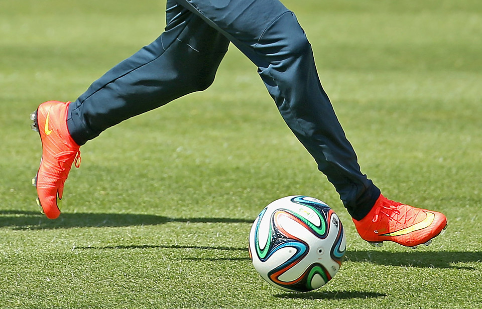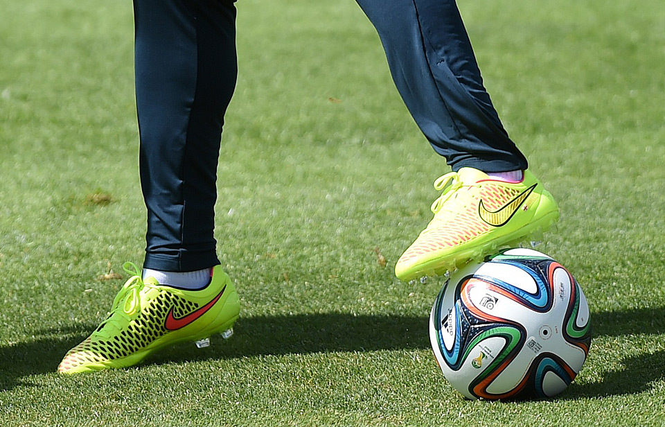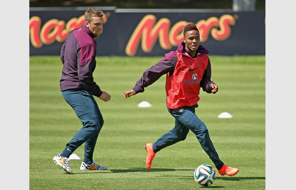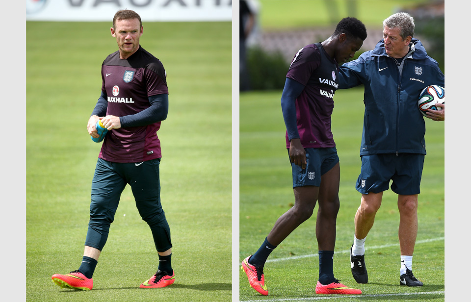 Providing a glimpse of the on-pitch battle set to kick off in Brazil next month England players contracted to Nike and adidas laced up in the Superfly, Magista and Battle Pack as Roy Hodgson lead a light training session in the Portuguese sun.