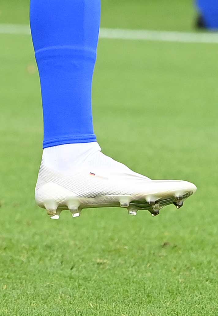 Timo Werner has made the switch from RB Leipzig to Chelsea this summer, and in his first training session at Cobham he not only showed off his ability, but also the new X. The new launch look goes the complete opposite to the blackout prototypes, taking on a clean white base look. The Three Stripes appear on the outstep in a fading gold tinge, giving off an almost spectral feel to the boots. A reverse adidas logo appears the tongue area, harking back to old F50s as well as the later 99 gram boots released by the brand, possibly included as an homage to the X’s roots.