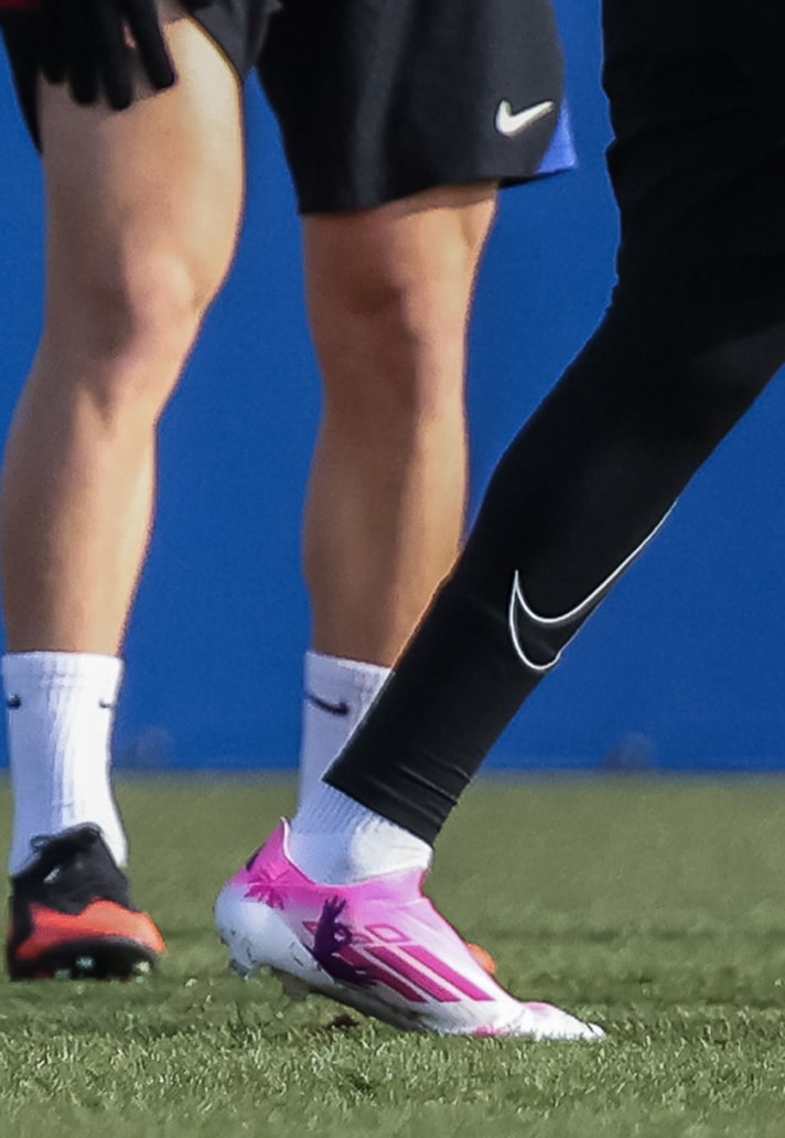 After being spotted wearing these custom F50's earlier in the week, fans were questioning whether another signature boot was getting ready to be unveiled. However, a video confirmed that these dark pink F50's were custom-made and gifted to Yamal by a fan. A pink and white colourway featuring Yamal's signature celebration painted on the sides, a lovely touch from the fan.