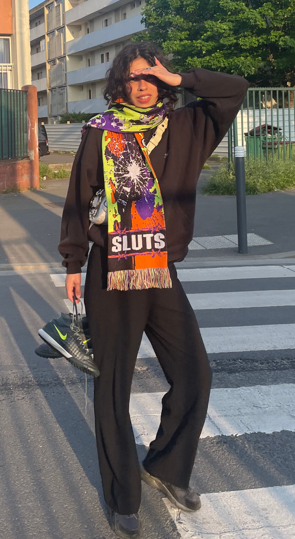 Fati Rouina: “The ‘Butch’ scarf (2023). It's very specific and in queer communities, ‘Butch’ is used to describe lesbians who are more masculine. I was afraid it would be a flop but this scarf was bought in 28 countries. it would have been impossible to do it with a brand. Anecdotally, butch lesbians were so happy and felt represented by having this scarf in a football space.”
