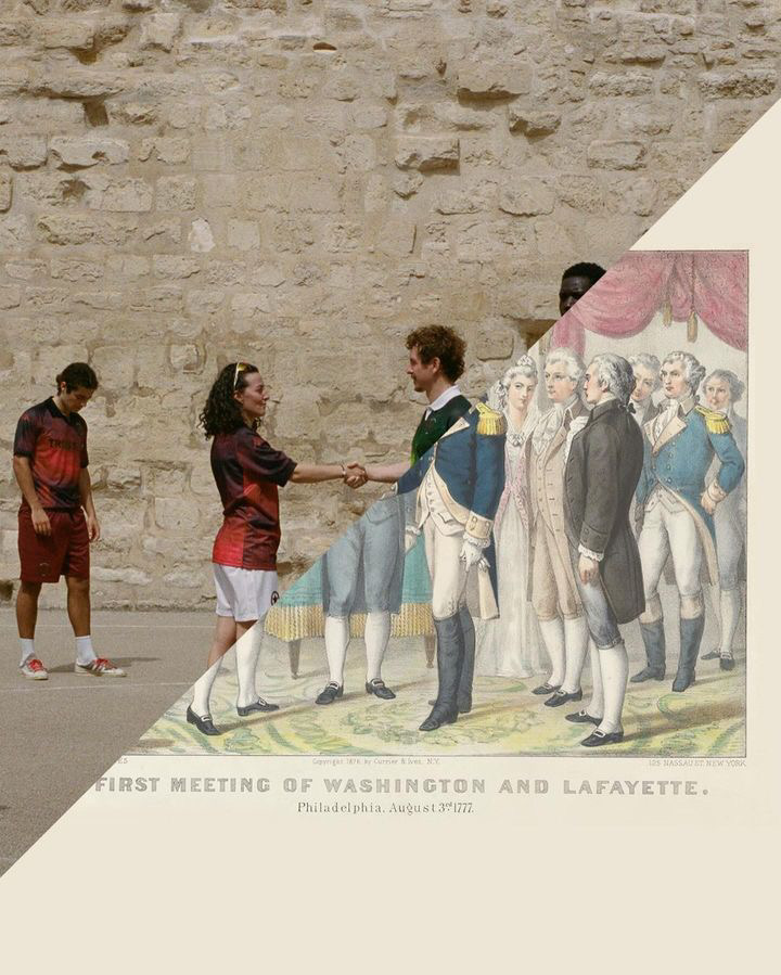 Game recognises game so Red Star FC creative director David Bellion asked Cacahuètes Sluts founder and Red Star FC fan Fati Rouina to be in the club’s artistic 2024/2025 jersey campaign. What happens when two visionaries, both known for collaborating with emerging artists and directing campaigns, push boundaries far beyond their Sunday kickabouts with other Parisian creatives? Rouina is cleverly cast as French General Lafayette shaking hands with KidSuper (here American General George Washington) on a football pitch wearing Red Star FC’s Away jersey. Thanks to the photograph being sharply collaged with The First Meeting of Washington and Lafayette—Philadelphia, August 3rd, 1777 lithograph (1876, The Met) in the style of artist Davide Trabucco’s CONFORMI project. “I’ve known him for six years and he convinced me. It’s really nice and chill shooting with David,” shares Rouina over Teams. “Because Red Star have David, they have successful creative design and cool partnerships.”