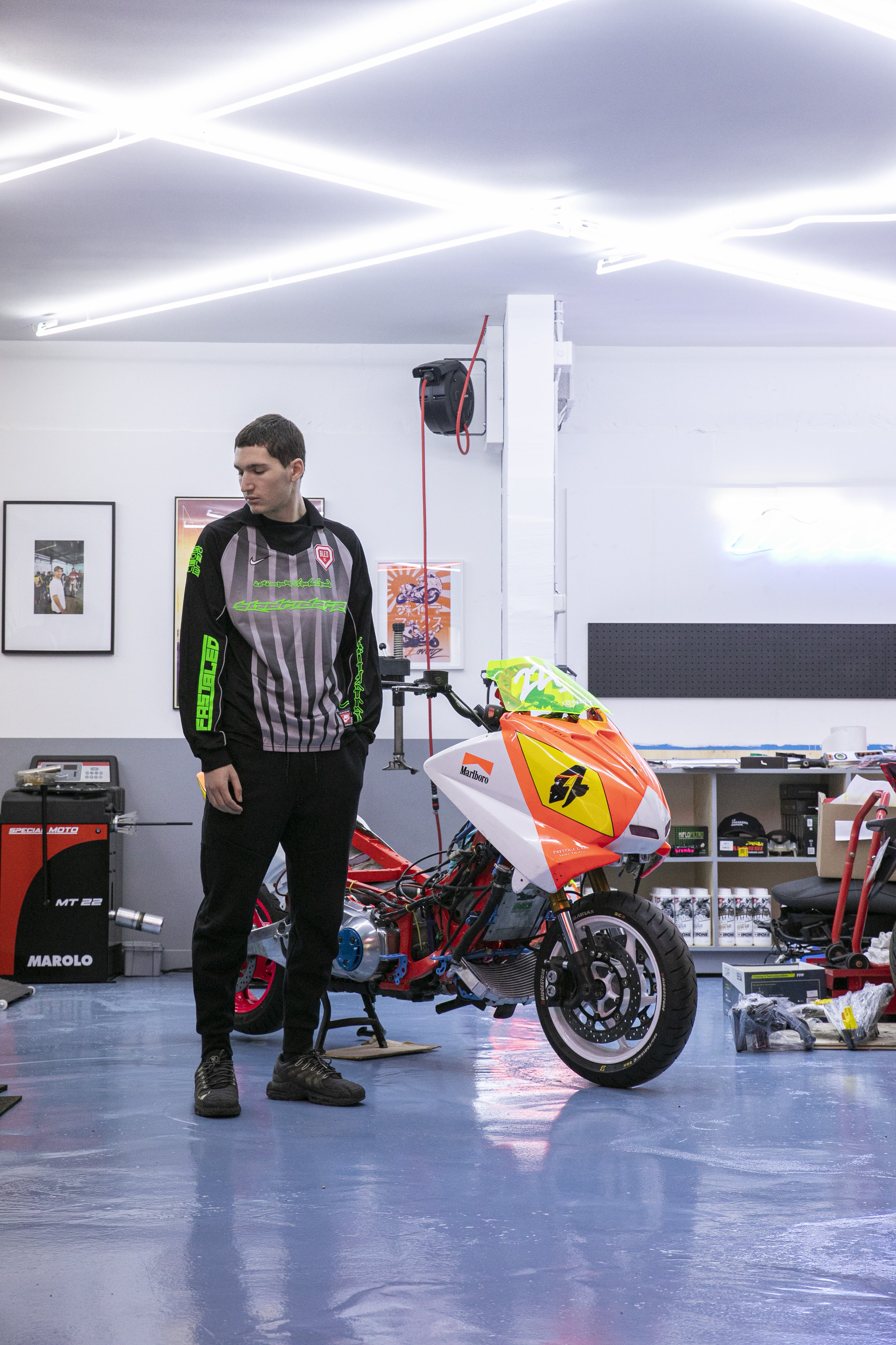 “I always begin by imagining a good story, a good concept that will become a good design. For example, I like the motorbike rider’s aesthetic and the big sponsors on their jerseys. I found some vintage goalie jerseys from 1990 and decided to mix both worlds to create a jersey collection named ‘Bled Riderz’, inspired by Japanese motorbike culture.”