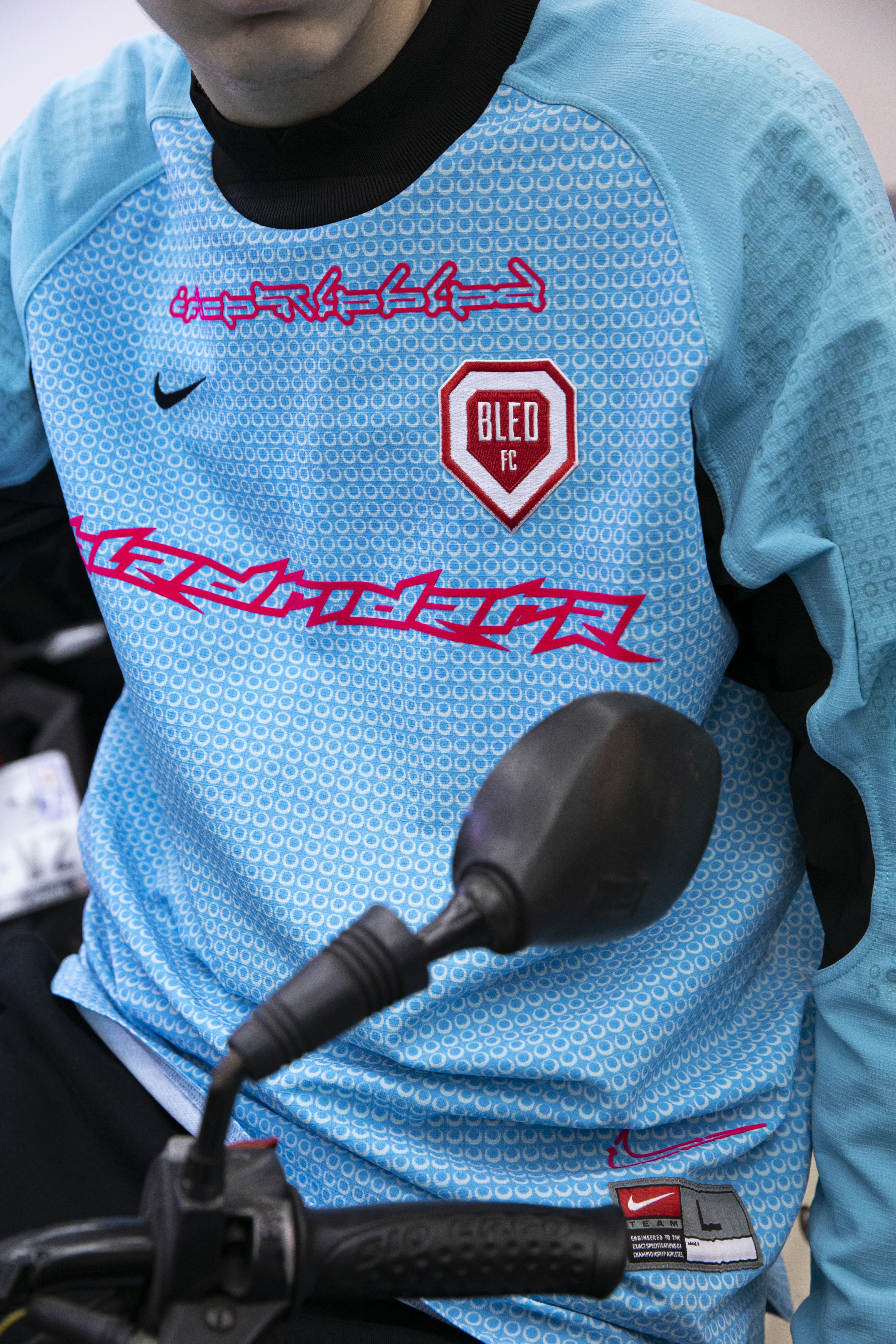 Case in point: the limited-edition Nike x Bled FC jersey (already reworked into caps by @leo_hatcrafts) that literally shocked everyone when it dropped in June 2024 at the Nike House of Innovation Paris. Kunn’s creative football studio were invited to be part of the Jersey by You program and delivered a light teal design covered in sublimated lightning bolt graphics to represent Paris’ energy (“The city of light, like a lightning strike”) with two velcro patches and interchangeable Bled FC and Swoosh logos. The Asian influences evident in the striking typography and campaign storytelling – go-to model Maeva Guyon is captured fishing and playing ball while wearing the jersey – are one of Kunn’s signatures.