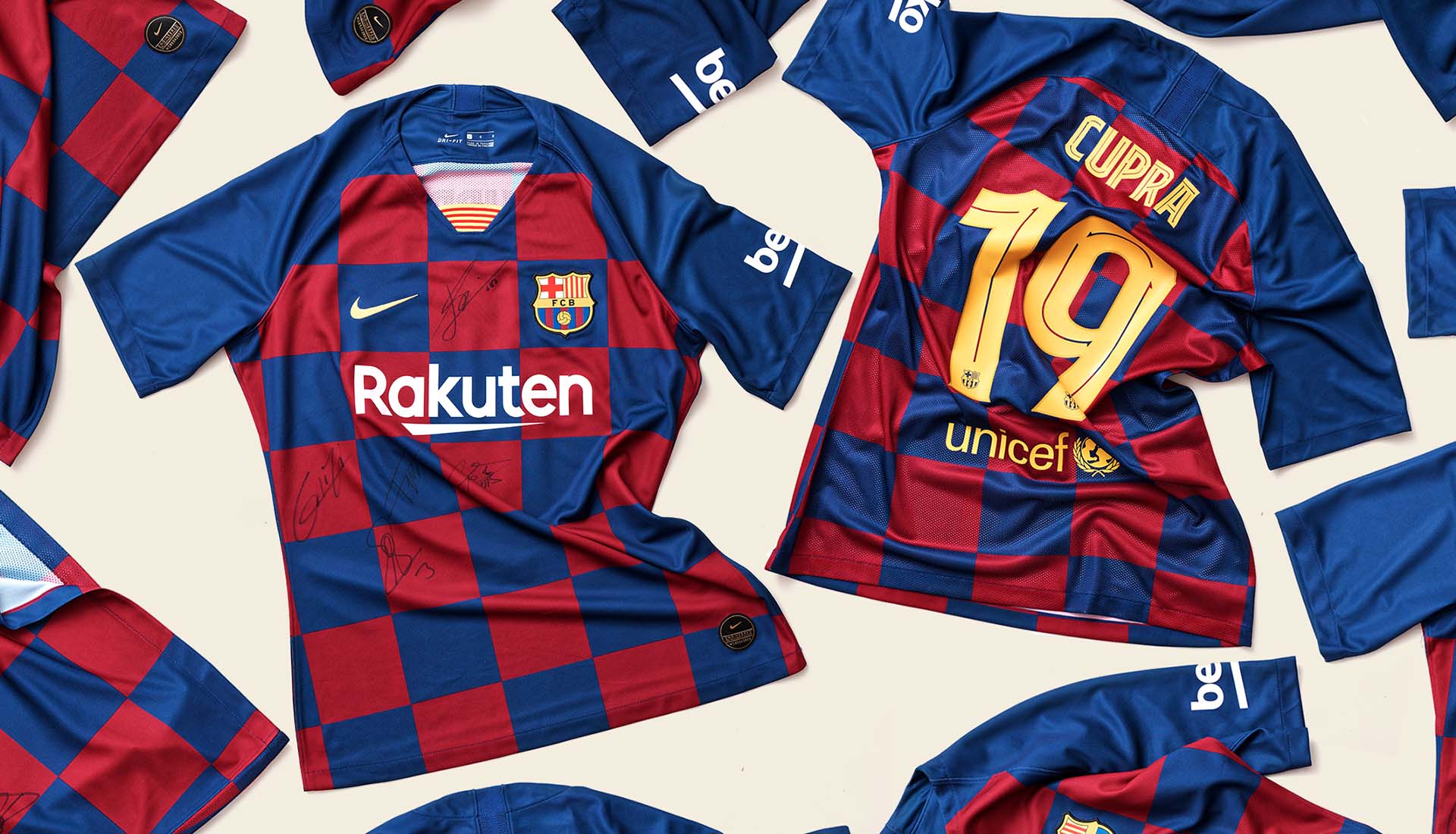 The 2019-20 home shirt, as worn in tonight's Champions League match against Bayern Munich has been signed by Barcelona royalty including Gerard Pique and Lionel Messi.