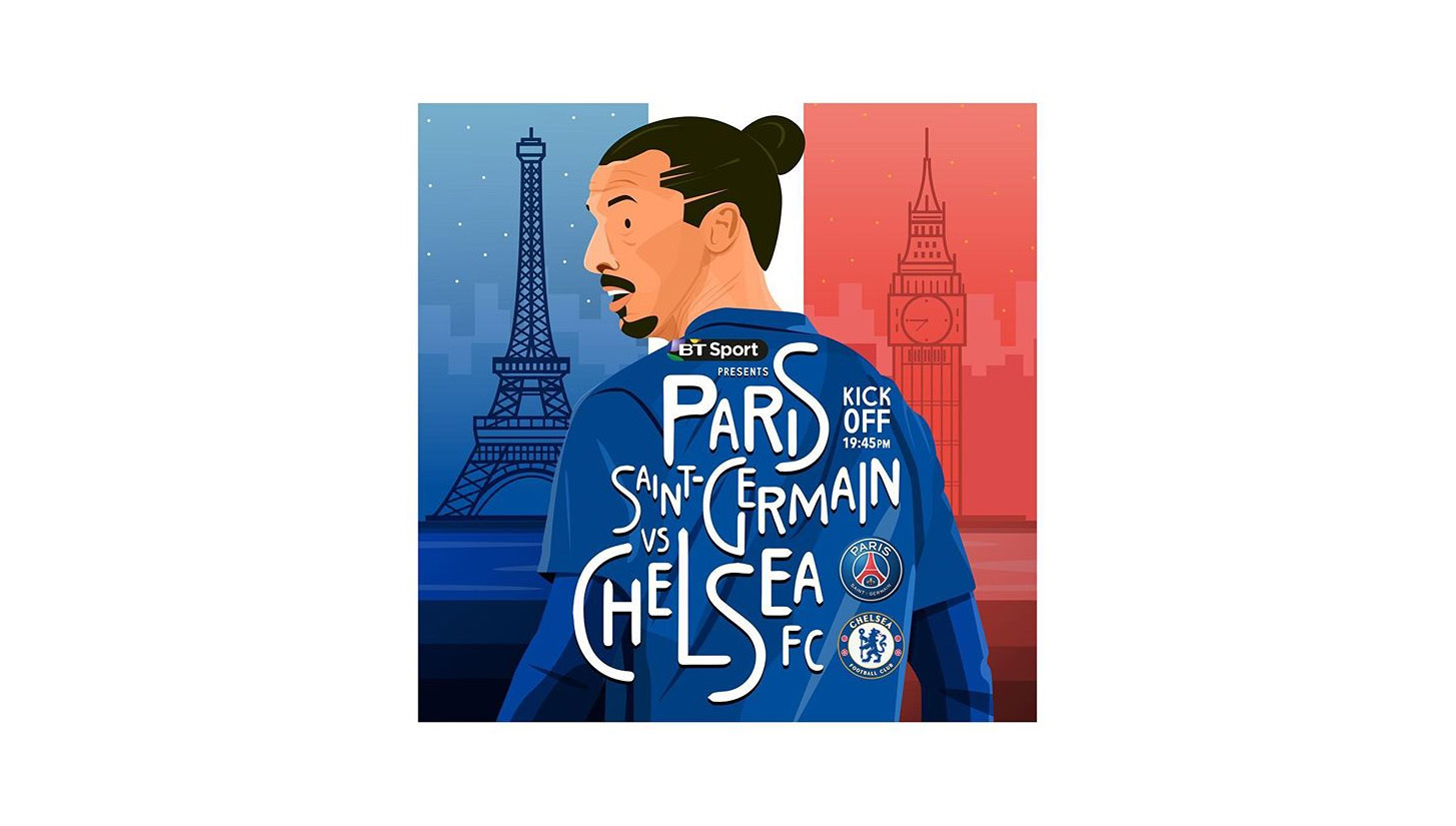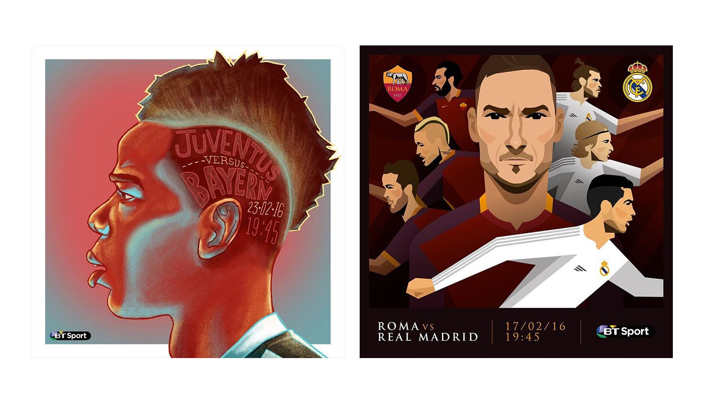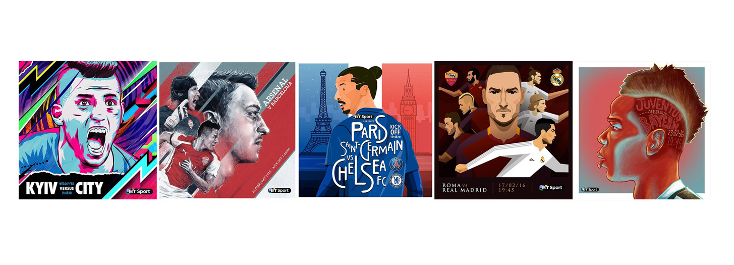 Those first five to be unleashed from BT Sport have been designed by Dave Will (PSG v Chelsea), Dave Flanagan (Roma v Real Madrid), Dan Leydon (Juventus v Bayern Munich), Dave Merrell (Arsenal v Barcelona) and Scott McRoy (Dynamo Kyiv v Man City). An off the pitch tournament nicely alligned with the on the pitch coverage, hats off to all involved.