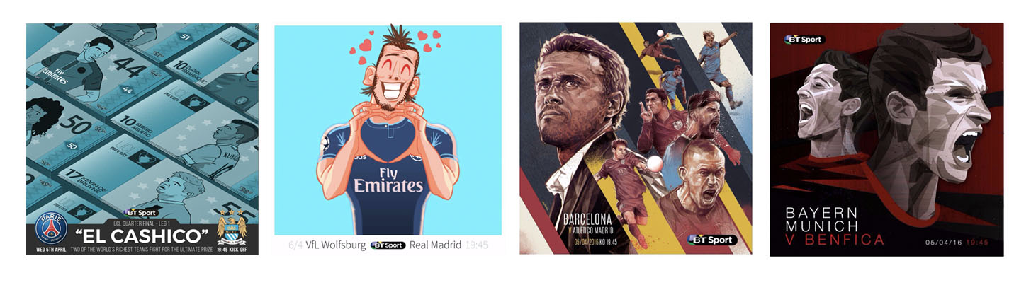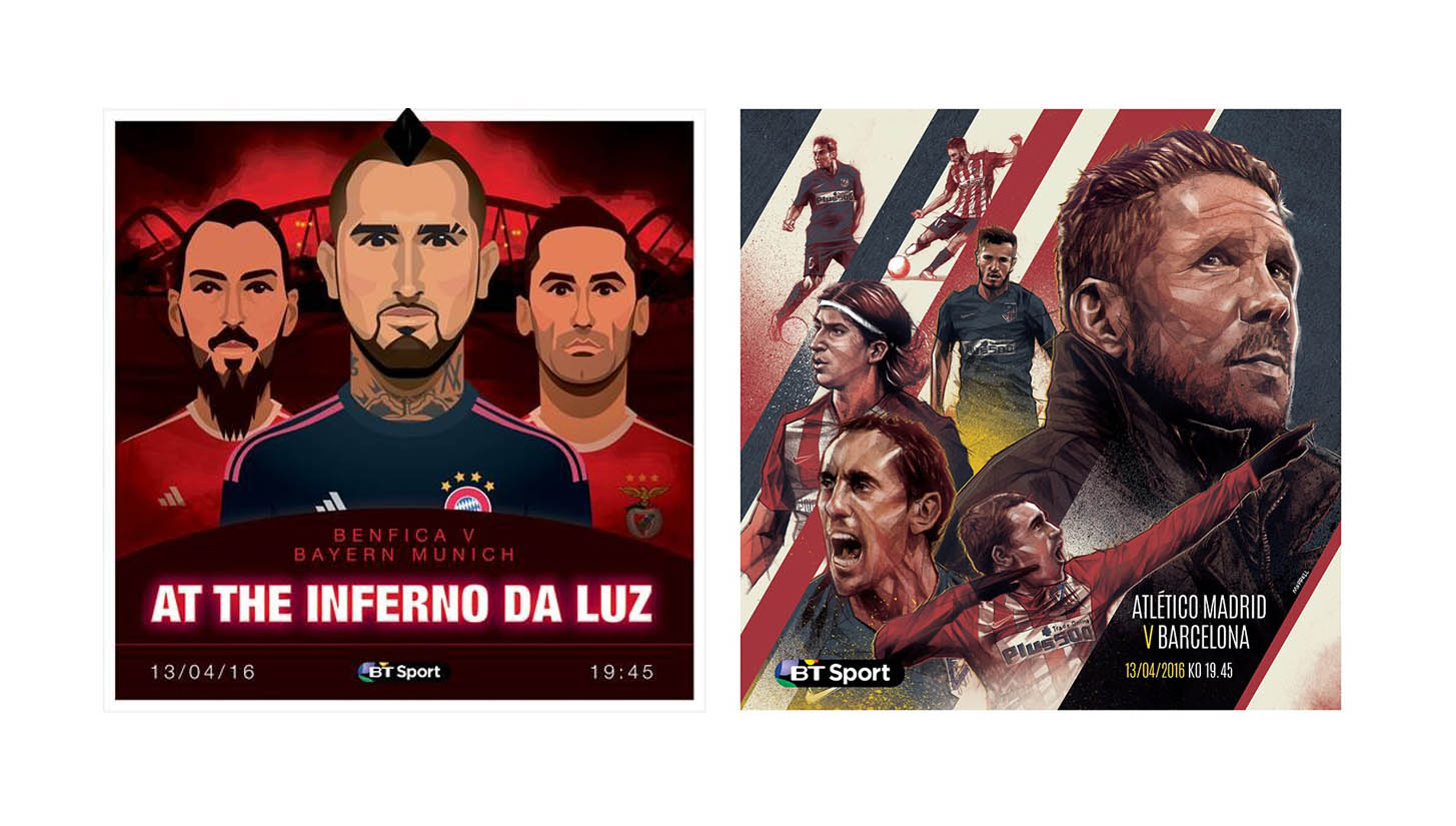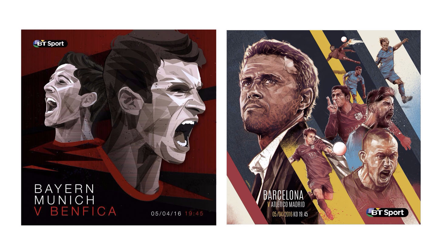BT Sport unveil the 3rd round of their #ChampionsDraw project. Illustrations owning part of the limelight equally, it's a feast of well designed football on show.