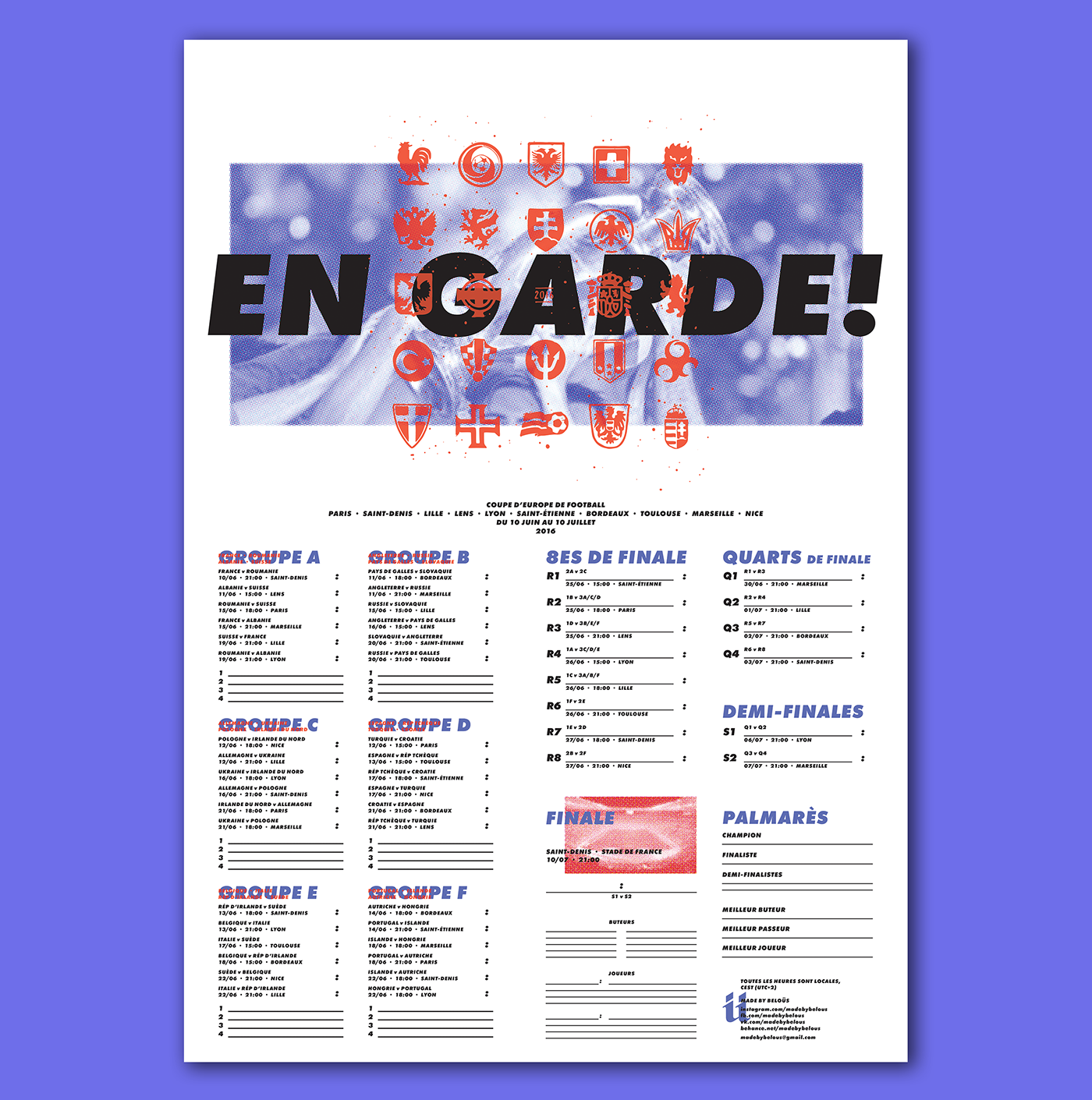 The translation of En Garde, "On (your) guard" is a command used in fencing at outset to warn the participants to take a defensive position. Ready for games that see attack and defence come head to head in search for European glory, this A2 poster completes the schedule for all games in the tournament.