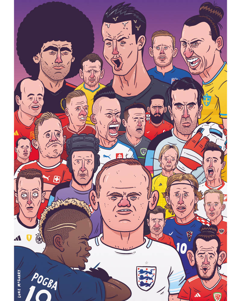 An illustrated party played out with pen in hand, this collection of portrait inspired designs from Luke McGarry add a curation of colour in depicting just some of those on pitch stars from EURO 2016.