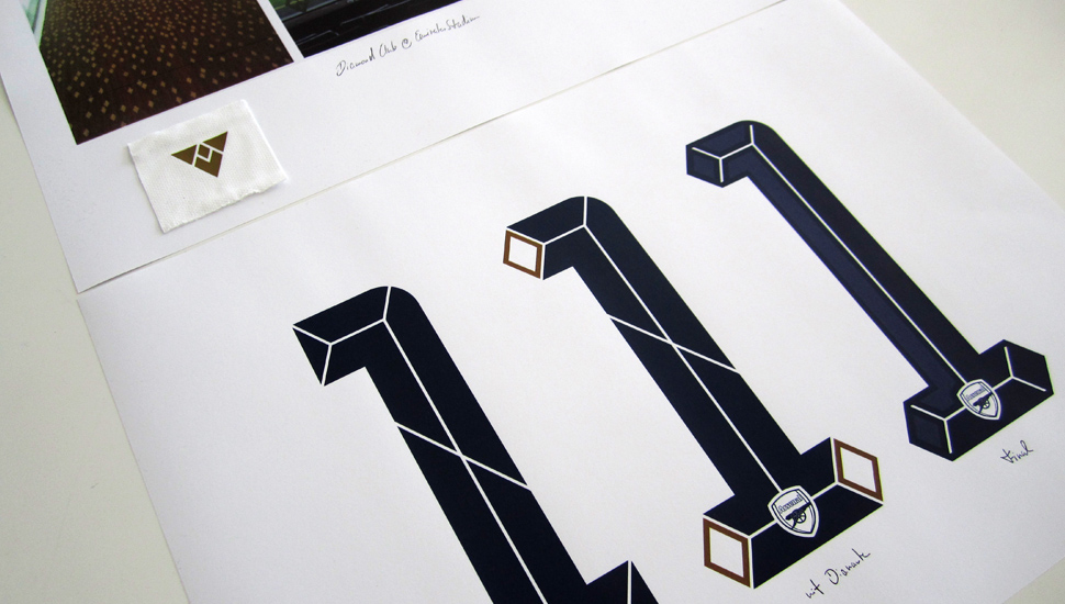 The creative direction for PUMA´s football collection was geometrical shapes. This perfectly matched the Art Deco era of Arsenal. Arsenal pay homage to this era with Herbert Chapman as their manager in their Diamond Club at Emirates Stadium. Our direction with this successful Chapman era was not only combined on the golden alternate shirt, but also extended into the numbers. We incorporated the diamonds into the glyphs and also added a small triangular "A" between the name and the collar.