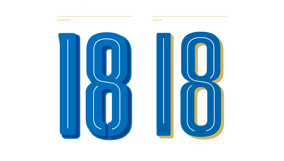 "Well firstly, all the national teams have the same type. Only the Italian numbers have a slightly different shadow effect. To match the trims and details of the rest of jersey, we decided to make this shadow in contrast gold. All the other teams have a tonal shadow effect."