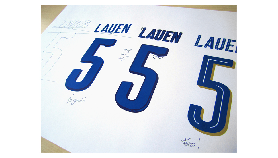 "Initially, the idea was to rotate the names and the numbers by 8°. This again came from movie posters and also from Usain Bolts famous pose. The outcome was great, even better as the final outcome, but unfortunately, it is too complicated in production and once it has been applied on the garment. What a pity! Another fun part in the design process, was to see, how far we can go with special glyphs. In 2014 we had a special 'A' for the ITALIA wording. This time, we tried to go to the extreme, but played it safe in the end."