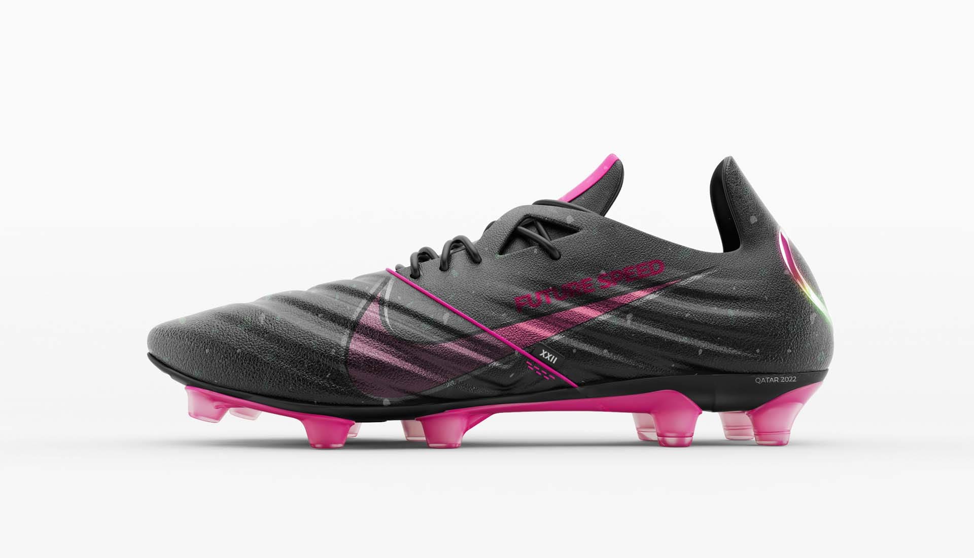 Aiming for the 2022 World Cup in Qatar, the design has been presented in a classic black, with one other colour flashing through details throughout, including the faded Swoosh, soleplate and soleplate. The forefoot features a cushioned vamp not unlike a Tiempo, while the mid to rear foot is made for a locked in fit, with a significantly dipped collar for comfort and manoeuvrability.