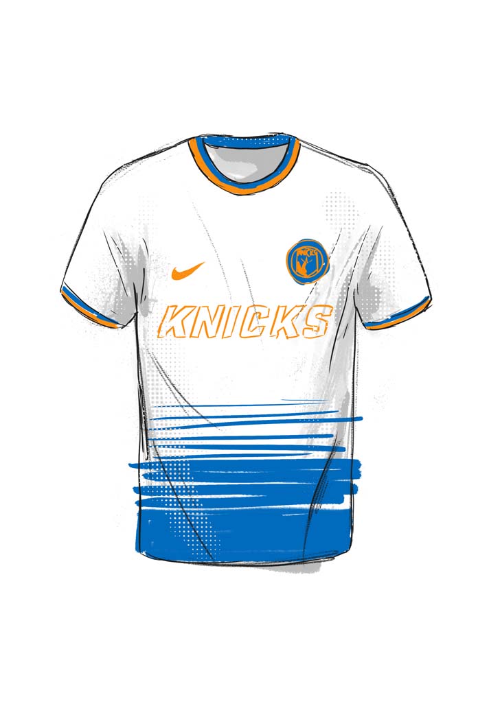 A lot of English football badges reflect imagery of the place they’re from. I used this to influence the Knicks badge. They’re the New York Knicks and what is the most identifiable landmark of New York? Has to be the Statue of Liberty. I surrounded it with a crest and wanted the type to sort of reflect the bright lights and glamour of the capital of the world.