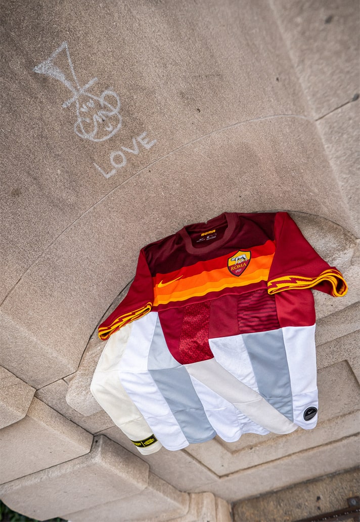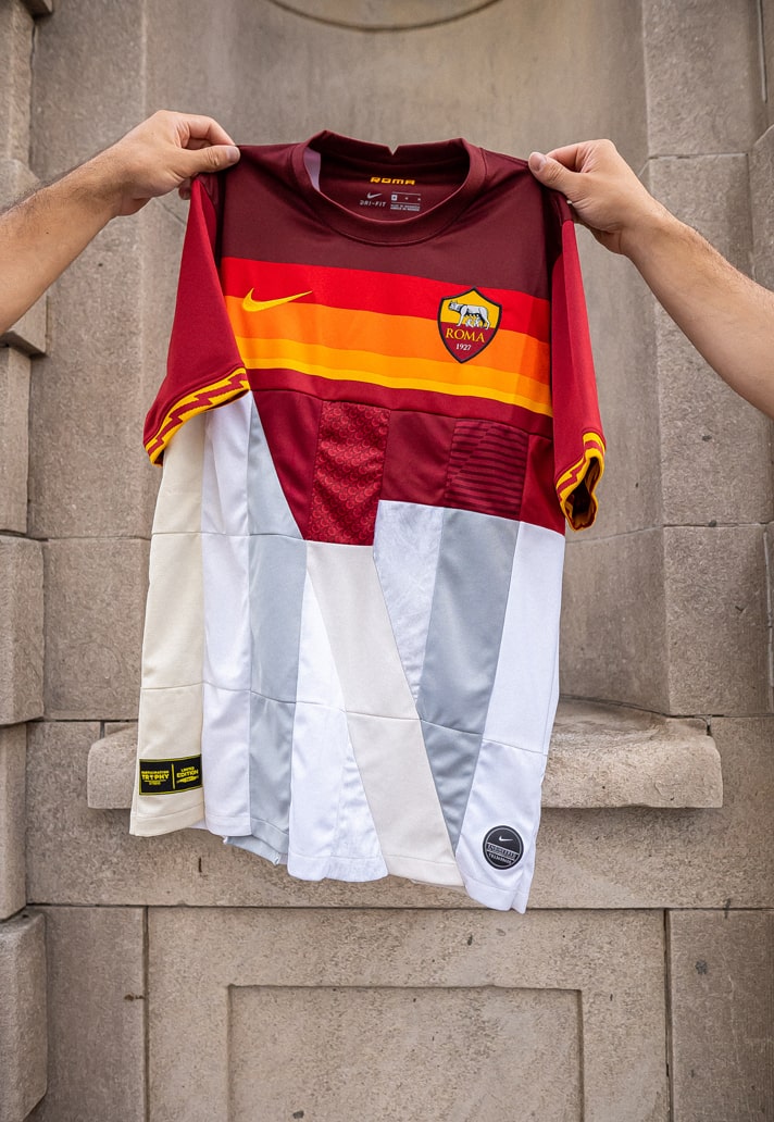 Among the shirts in the 'Colosseum' mashup are some iconic designs, such as the lightning trim of the cream/marble coloured Lupetto kits, and they’re matched by designs that carry added meaning due to some of the moments in which they were worn, such as Roma's 3-0 comeback vs FC Barcelona in the Champions League. The ‘Colosseum’ is a 1 of 1 mashup jersey that pays homage to the various memories over their seven year partnership, with pieces of every home and away kit that the brand and club released together. It’s made up of 51 individual cuts of fabric from 15 different Nike x AS Roma kits, with the overall design being a classic style mosaic depicting a sunset over Rome’s famous Colosseum – Apt.