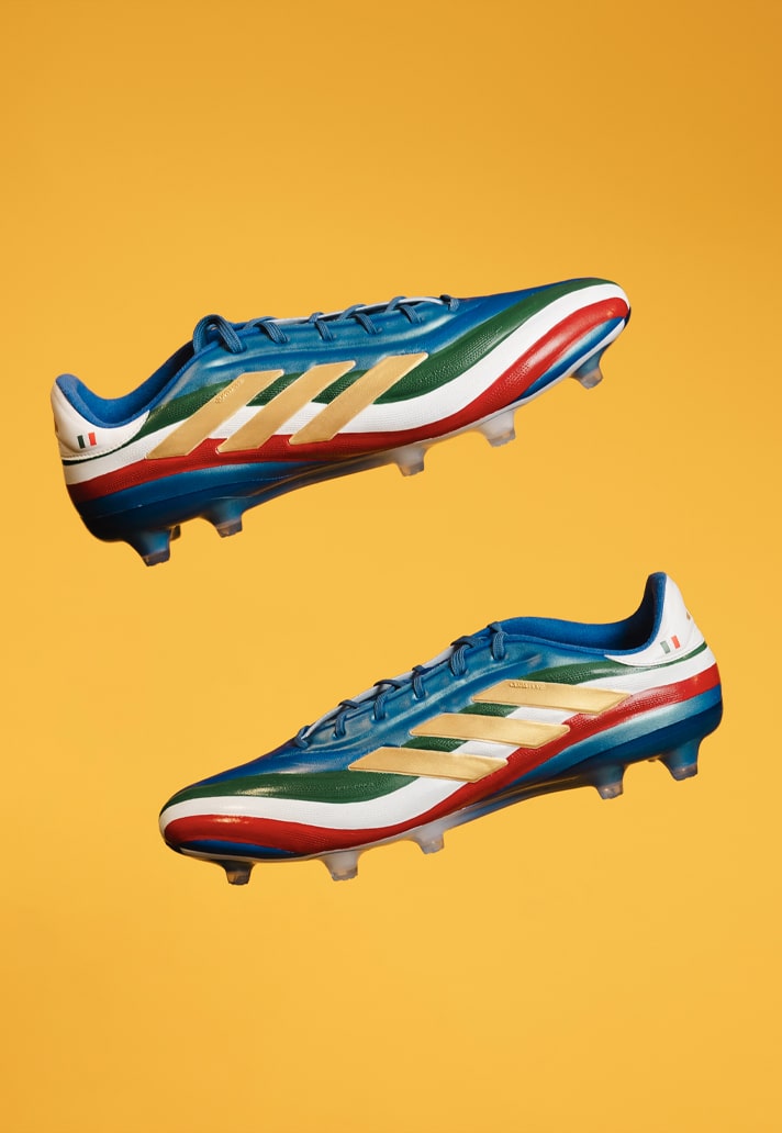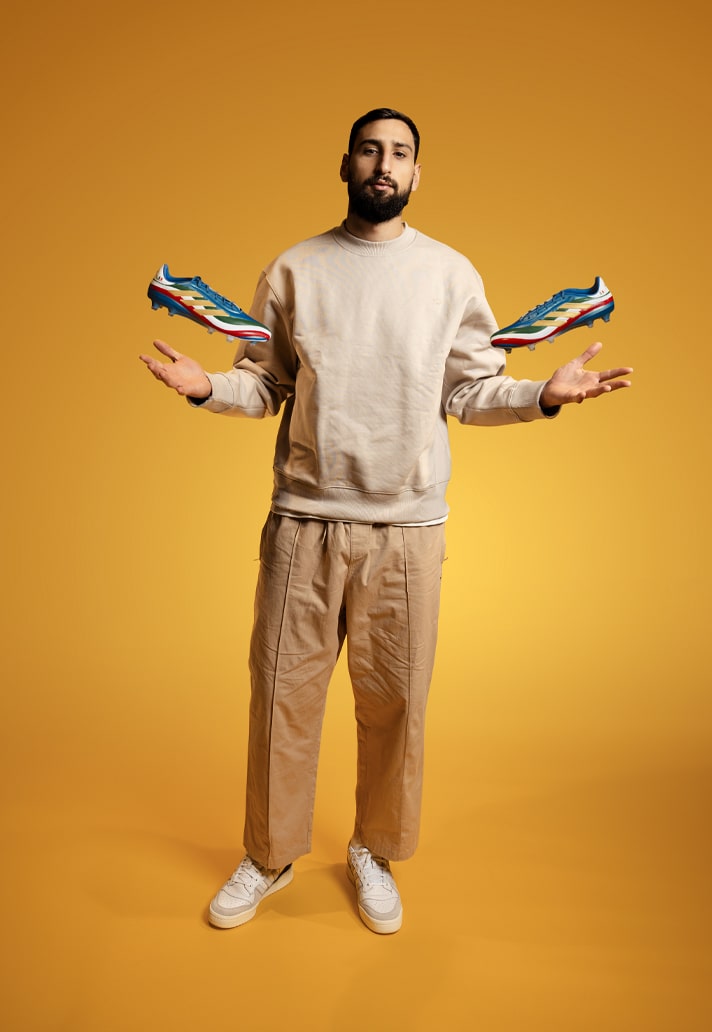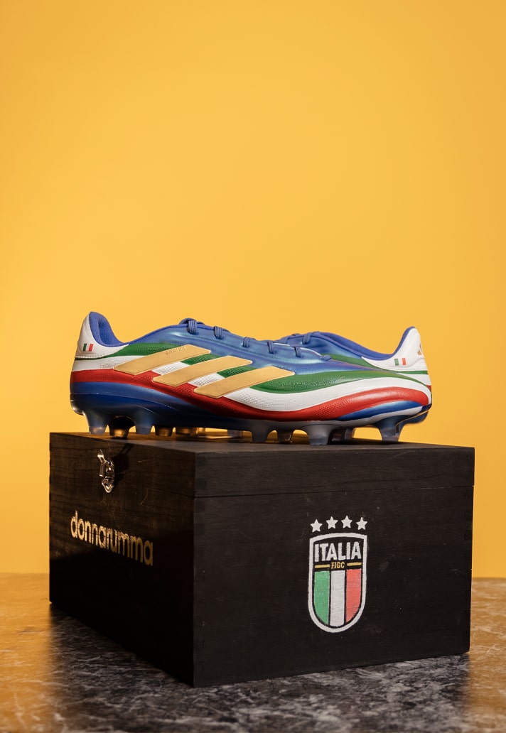The boot and glove combo has been created in celebration of Italy’s Euro 2020 win (hey, better late than never!) and they were presented personally by Dawson to Donnarumma at adidas’ Paris Headquarters.