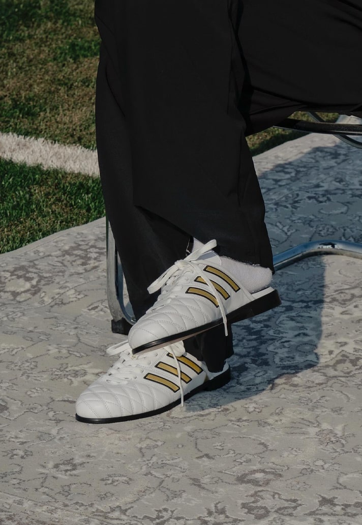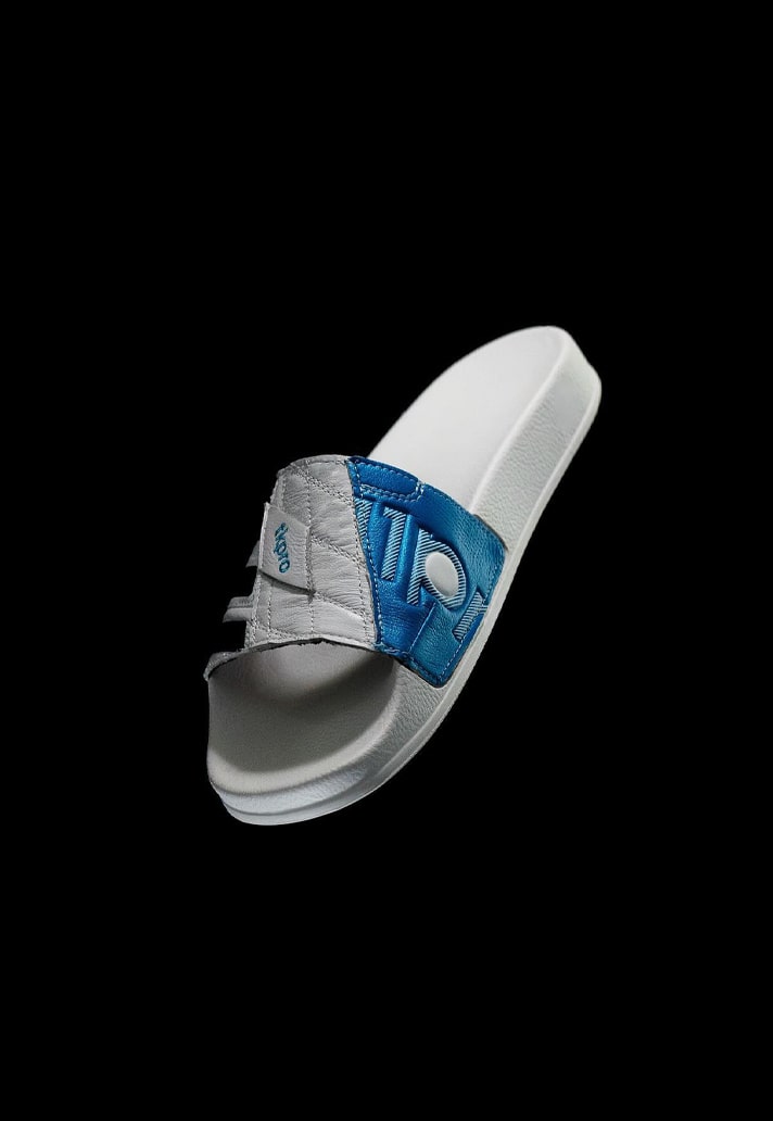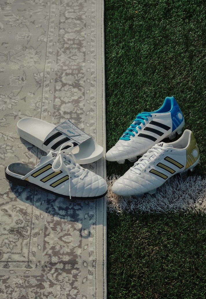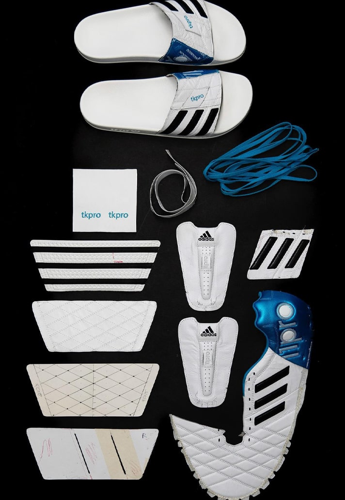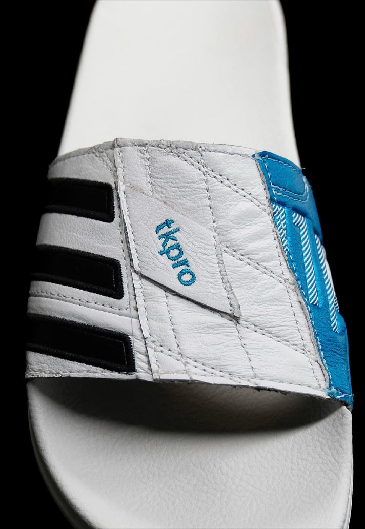The TKPro adilette then highlights the iconic adidas 11pro on its strap, incorporating elements from the original shoe. The strap’s reverse side is lined with a thin neoprene/cotton fabric, and it is also adorned with the new TKPro embroidery.