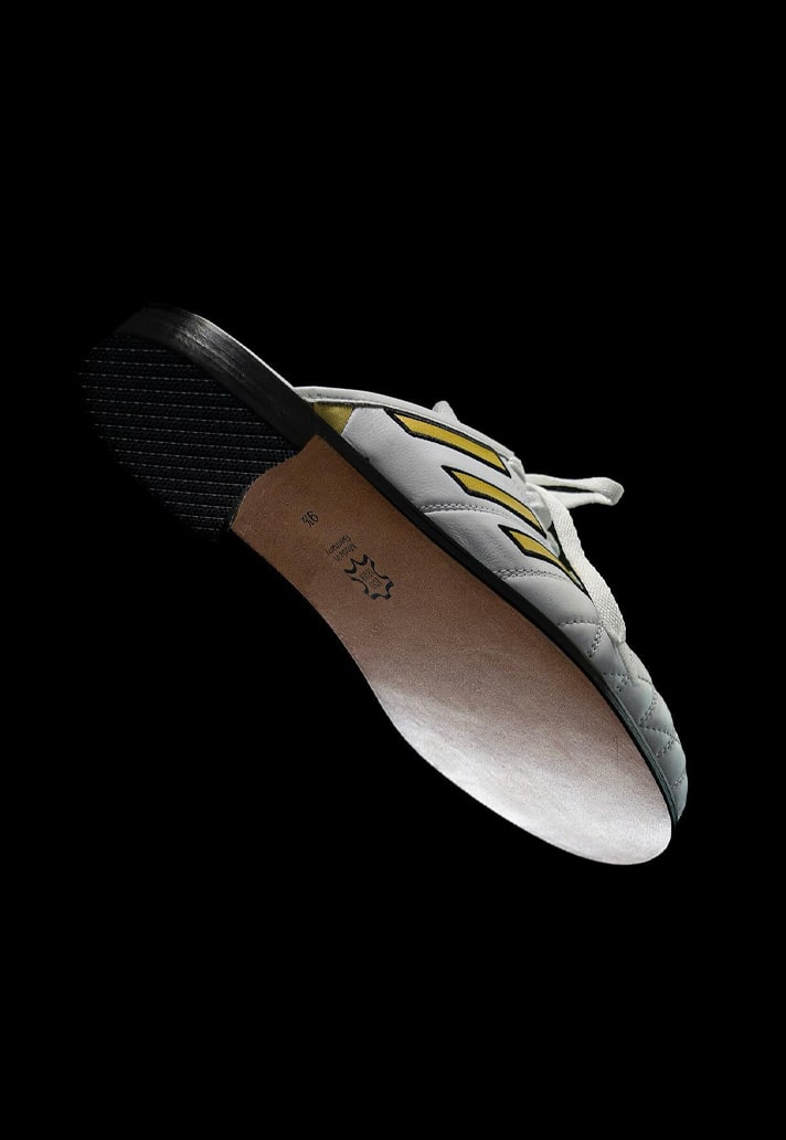 Taking the recently released limited edition 11Pro TK, the lux slipper stands out with its distinctive cut in the upper at the rear quarter panel, detailed with soft leather binding. It features a black leather insole with a white trim, perfectly aligned with a leather sole and heel, all made in Germany. Extra comfort is provided by multiple layers of foam padding, while new golden TKPro embroidery adds a touch of elegance.