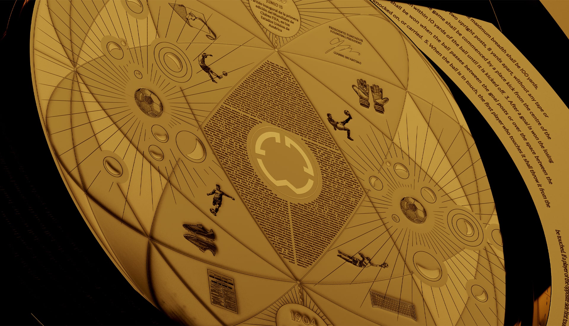 The trophy is made of gold vermeil and its surface is laser-engraved on both sides with text and imagery that portray football’s rich history and timeless artefacts.