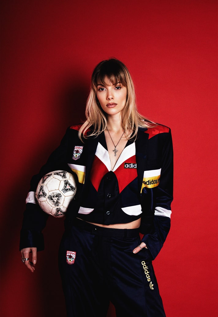 The collection, comprising 12 reworked one-of-a-kind garments, showcases inventive pieces like vests and cross body bags crafted from damaged vintage adidas predator football boots, unique sweater creations using old football scarves, technical trousers incorporating goalkeeping gloves and an early 90s Arsenal tribute tailored suit. Each creation is a heartfelt homage to the cultural and footballing legacy of adidas, seamlessly weaving the spirit of the past into contemporary and future fashion narratives. The collection is accompanied by a curated assemblage of over 100 football shirts and merchandise.