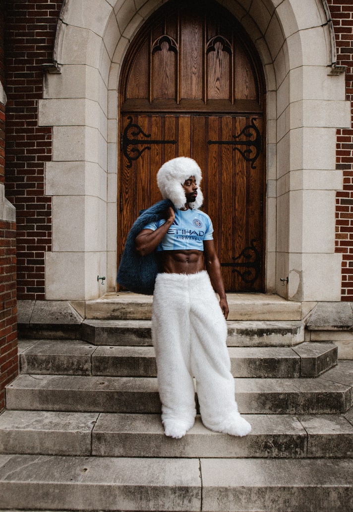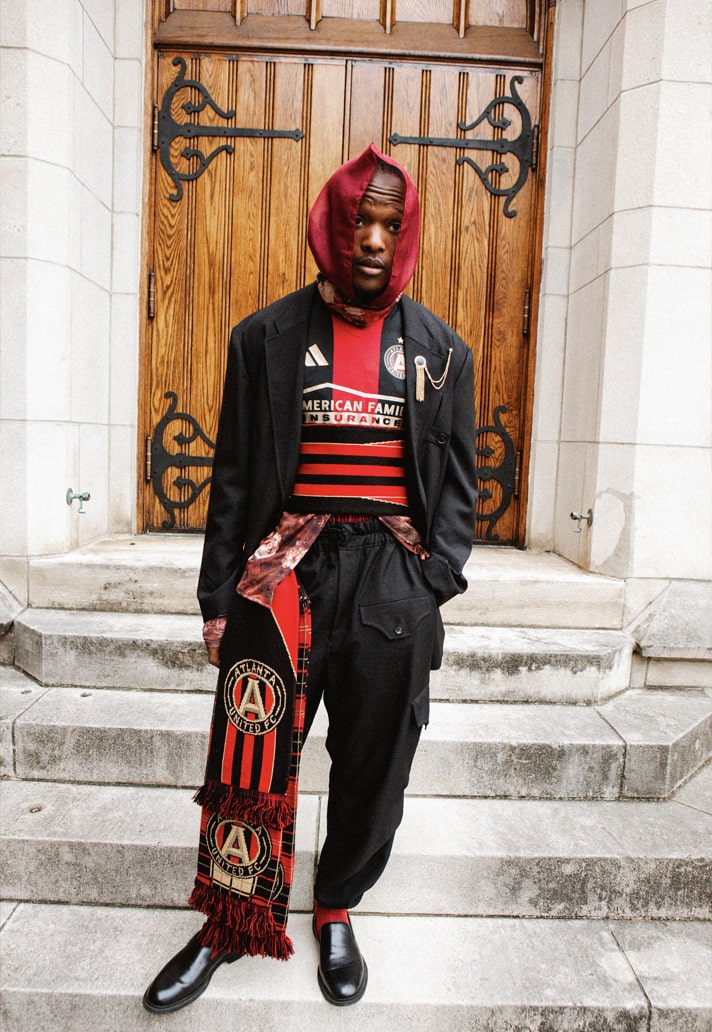 Playing into the club’s chrome branding and woven tagline, this design reimagines jerseys into a custom interlocked jacket and pant set, merging futurism with craftsmanship.