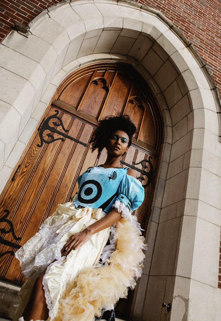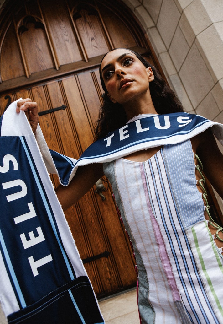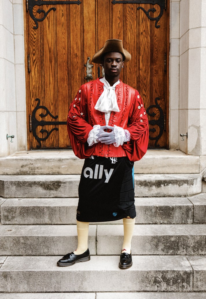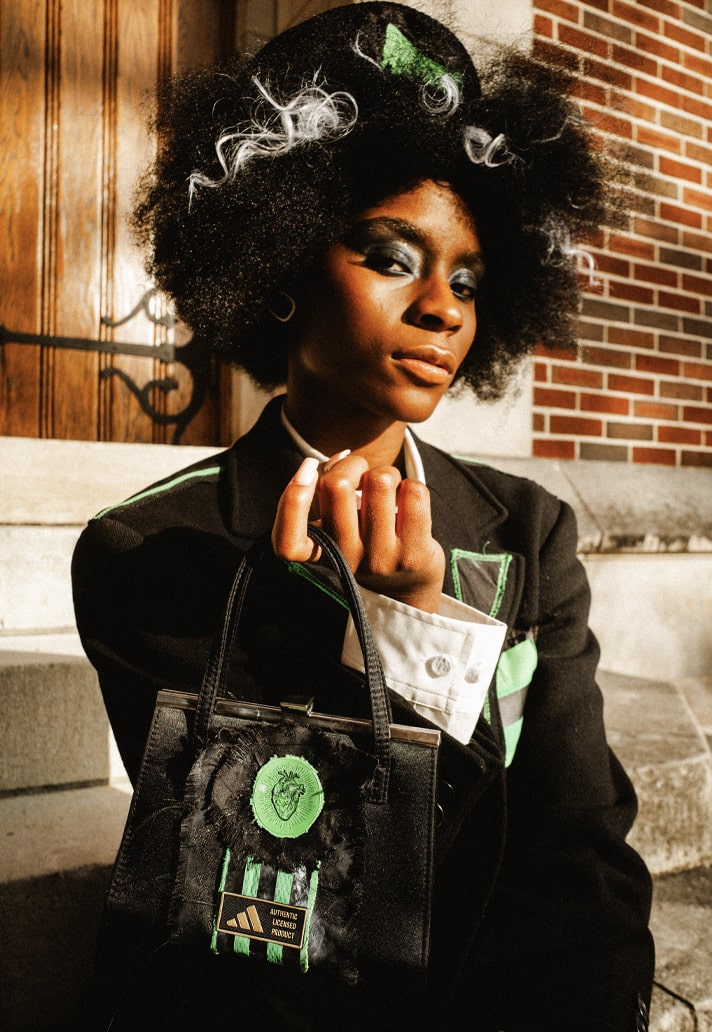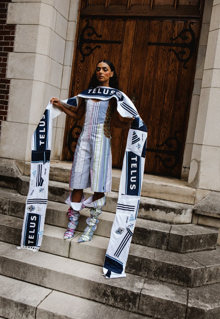 Taking cues from Jeremy Scott, this look includes a custom beret, blazer, and bag, all repurposed from the team jersey to create a high-fashion ensemble.
