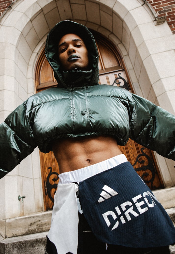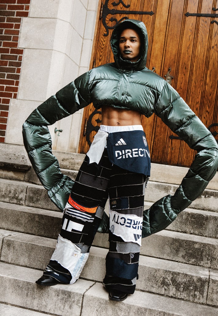 Referencing Miguel Adrova’s Fall 2012 collection—the first upcycled football collection—this look embraces sustainability and reinvention.