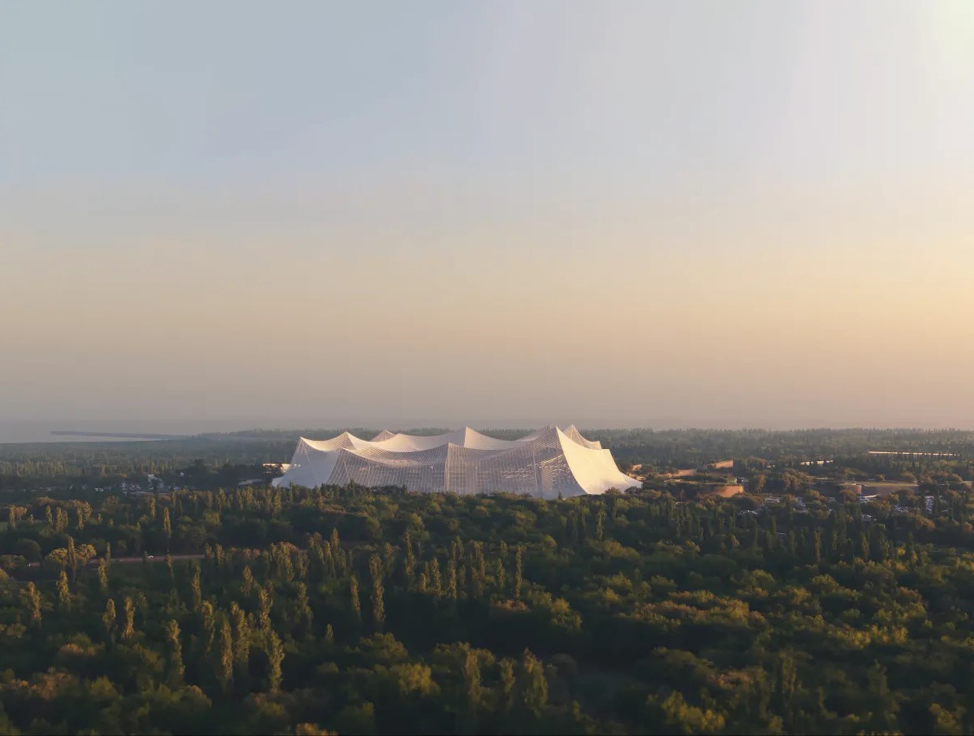 Designed by the Paris-based Moroccan architect Tarik Oualalou of OUALALOU + CHOI in collaboration with global stadium specialists Populous, the Grand Stade Hassan II is football architecture reimagined. Its design nods not only to cutting-edge engineering but to heritage, too — drawing inspiration from the “moussem,” a traditional Moroccan social gathering rooted in unity, community, and ritual. The stadium emerges from the landscape like a monumental tent, its floating, tent-like roof formed from a translucent aluminium lattice that casts a surreal glow by day and night.