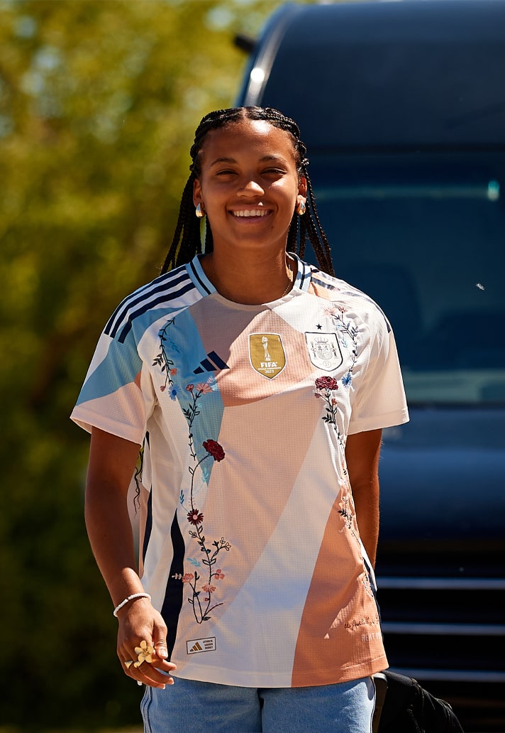 First spotted on the shoulders of adidas icon and Spanish baller Vicky López as she checked into training camp, the adidas Football x The Football Gal Limited Edition Spain Jersey is a wearable canvas of national pride, nature, and femininity. Built on the bones of Spain’s current away shirt, the jersey gets a transformative upgrade through the eyes of The Football Gal, who brings her signature contemporary, floral-driven design that hits harder than a top-bin screamer. Sitting at the heart of it all is the carnation—Spain’s national flower—embroidered proudly in all its passionate, symbolic glory. Around it? A field of native blooms: daisies, poppies, dianthus charidemi, and the dwarf Spanish foxglove—each chosen for their colour, texture, and deep cultural roots.