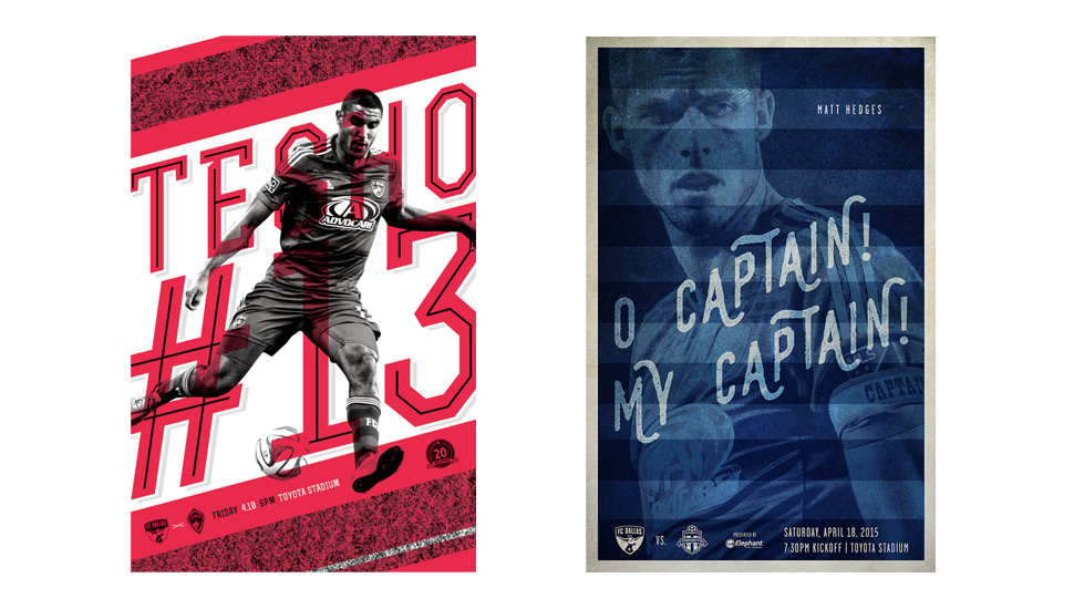 We recently launched a commemorative Match Poster series. This is something Olivia and myself have been wanting to work on for a while so we just decided to go for it. The only rule I had for this was that these had to be intentionally off-brand of what our current FC Dallas look and feel is. I wanted this to be a great creative outlet for us and a fun way for the fans and supporters to connect with our team and grow that supporter culture. So far the response has been awesome and we’ve found that both the fans and players anticipate what’s coming out next!