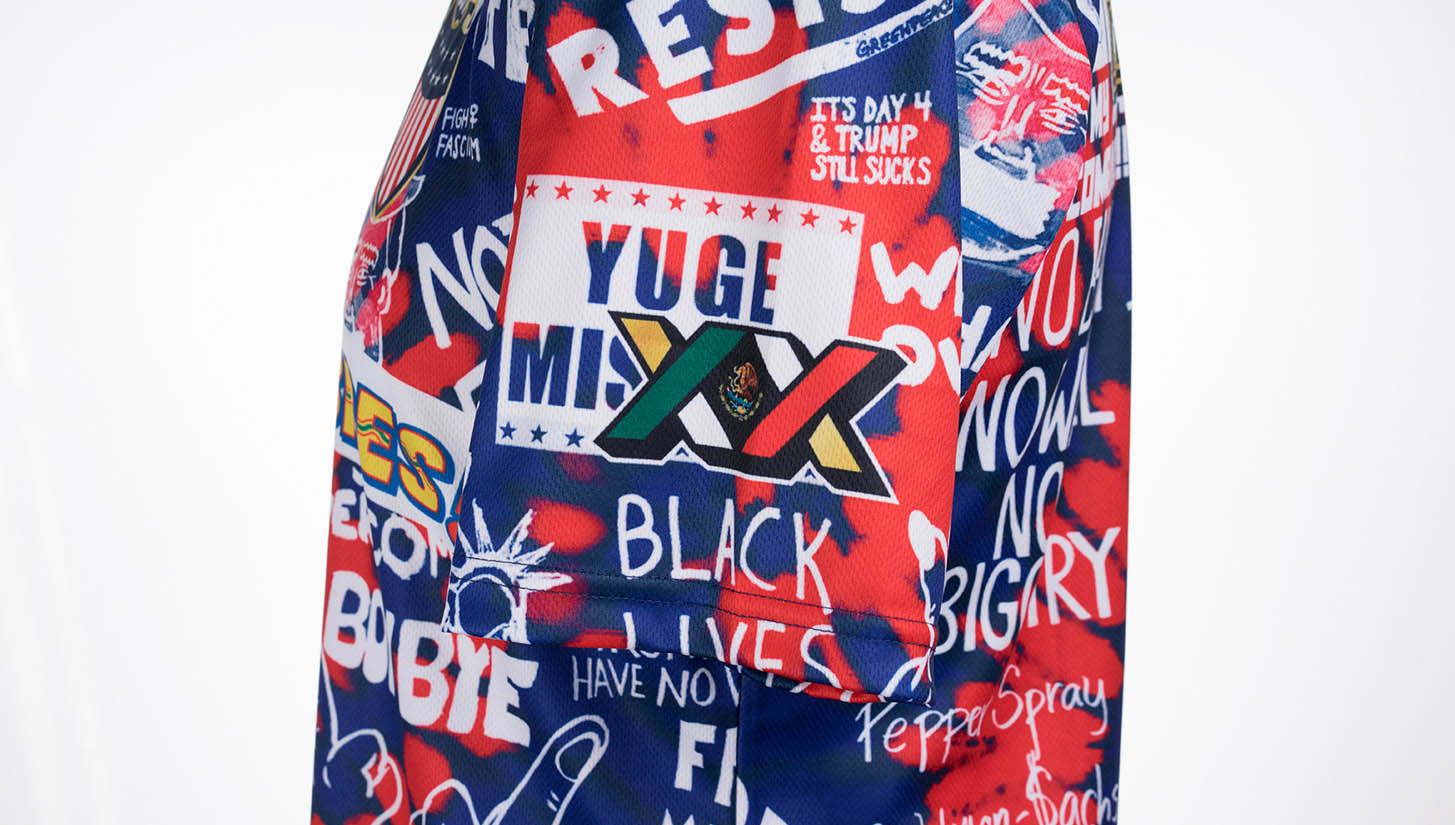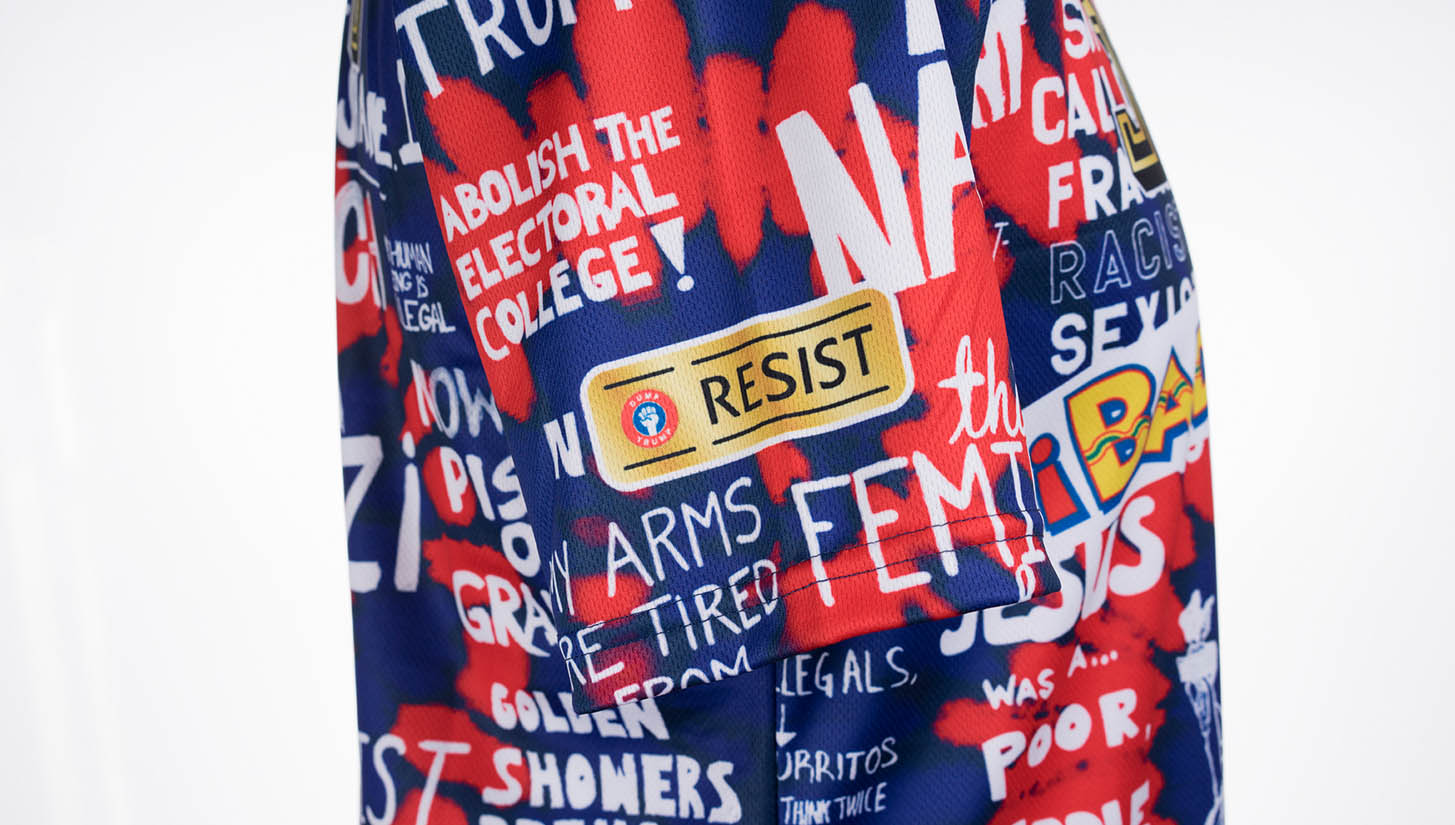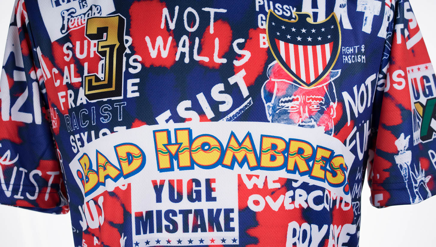 Jason Lee, AKA Eldejo goes on to explain, "the allover pattern is inspired by the resurgence of protest and is a compilation of the many slogans against Trump and all forms of divisiveness. It's set against a tie-dye pattern in American flag colors, symbolizing the protest movement of the 60s. The crest is the United States of friggin' America. Front sponsor is a play on the Three Amigos! movie title font replaced with Bad Hombres! The Left sleeve badge is a mashup between the Mexican beer Dos Equis and the Mexican flag, a sign of support for our brothers and sisters within the States and down south. The back is with "El Guapo", one of the characters from the Three Amigos! Right sleeve badge is a spinoff of the UEFA Respect logo, replaced with RESIST and Dump Trump."