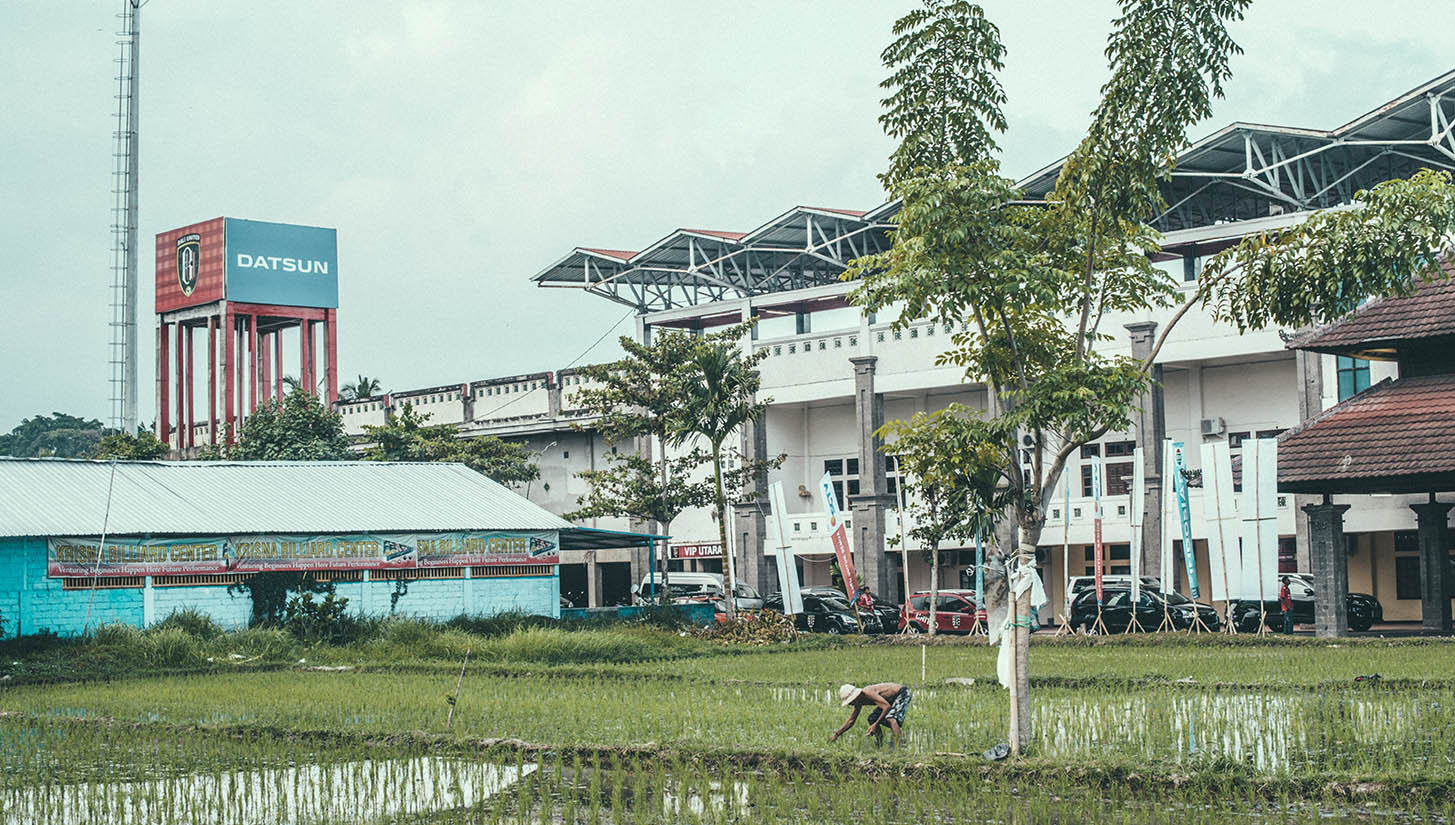 "Bali’s home ground - Kapten I Wayan Dipta Stadium - is a 25,000 capacity stadium and all the roads leading to the stadium are lined with coconut trees. Right outside the main entrance is an old farmer knee deep in water planting rice in his paddy field and this really is a reminder that you’re still on a beautiful tropical island. Being the only team in the league based on the island, it makes it hard for away fans to travel so 99% of the fans are wearing the red of Bali United. (There’s 18 teams in the league and they’re all dotted around the many islands of Indonesia, although 8 are based on Java, the main island)."