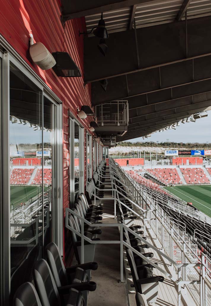 The stadium has been designed to reflect the industrial heritage of the historic Longhorn Quarry, in which the stadium has been constructed. The metal façades and the metal roof canopy that extends over the west side suite balconies and stadium seating together amplify the crowd noise, creating an atmosphere that often defies the numbers present. The permanent west side roof canopy combined with lower bowl stadium seating that starts only 17 feet from the touchlines gives Toyota Field an intimate feel, a quality that the club would no doubt be keen to retain with the planned future expansion phases.