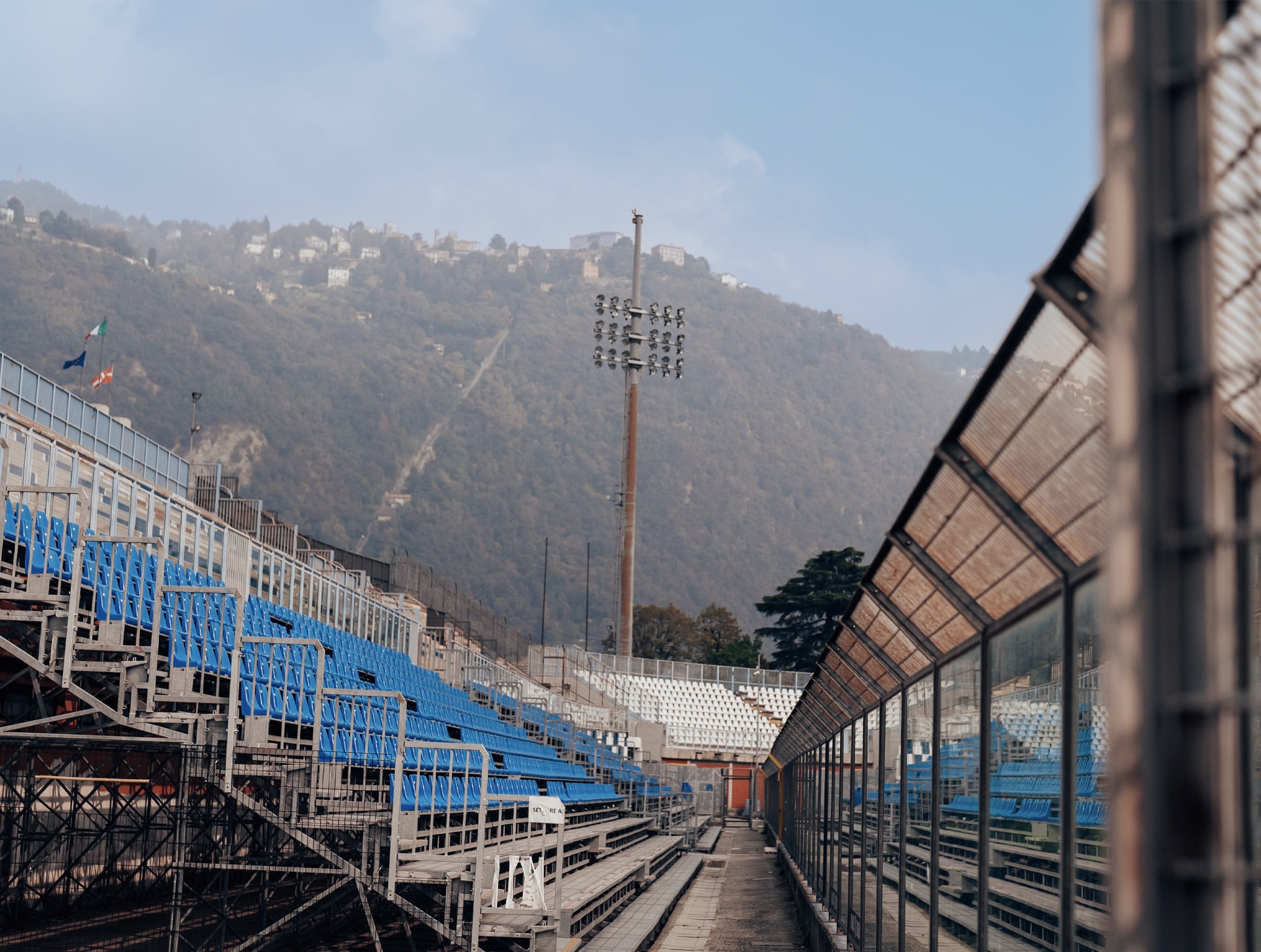 Located a breezy 15 minute walk from the city centre, the stadium was originally oval-shaped and included a cycling track around the pitch. It remained largely unchanged until 1990 when the main stand was replaced, and that was followed the historic “Curva Azzura” getting transformed in 2002 into the “Curva Como”. The Curva changed from a concrete structure with scaffolding pipe, to a structure made entirely of scaffolding pipe and with a capacity that increased from 3,500 to 5,000 spectators.