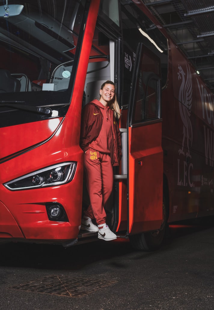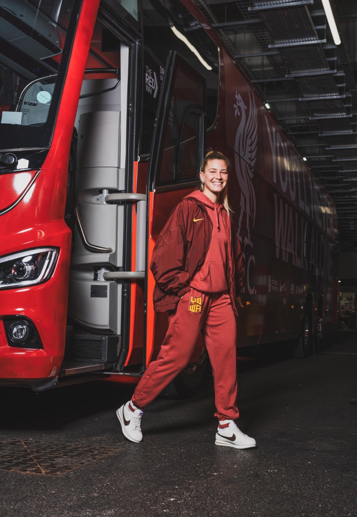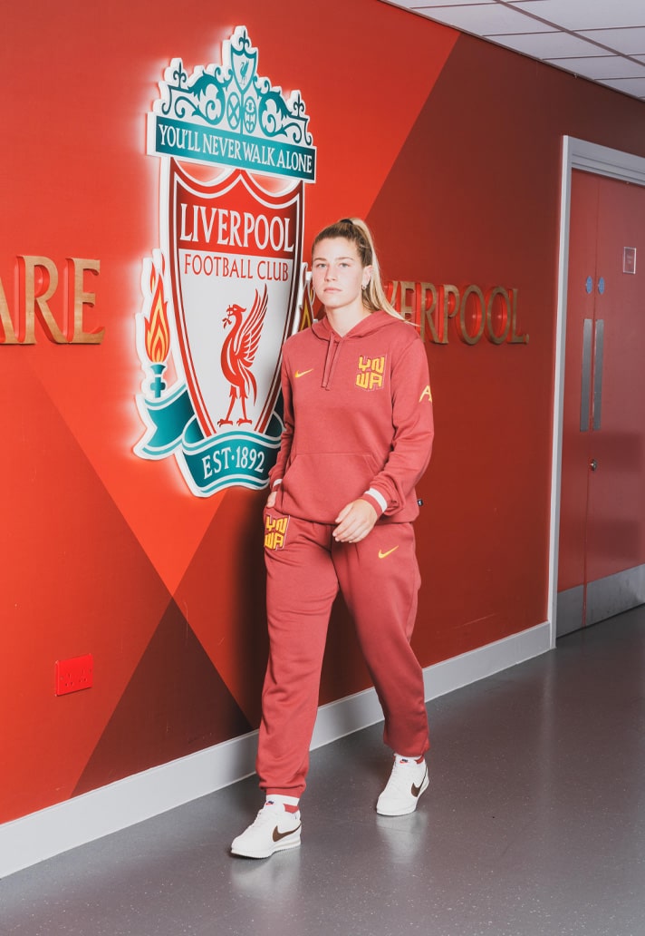 I found myself in this environment as part of the SoccerBible team tasked with shooting Nike’s latest LFC lifestyle collection. As a small unit of creatives on the day, we liaised at Liverpool Lime Street station before descending upon the historic stadium to get setup. The brief was pretty straightforward: capture stills showcasing the new apparel pieces on Liverpool players Virgil Van Dijk, Cody Gakpo, Jarell Quansah, and Marie Höbinger. The collection itself sees an array of tonal red hues spread across a tracksuit, hoody and joggers, all designed for comfort and to be as much about style in everyday wear as they are about practicality, all while showing support for the team. The latter point is achieved once again through the use of the “YNWA” (You’ll Never Walk Alone) acronym, which has been central to Nike’s jersey designs and collections over the last couple of seasons. Here it’s applied through embroidered patch work on the hoodies, and through a similar, albeit more subtle, graphic on the tracksuit, carried across from this season’s home shirt design. The collection was debuted alongside the club’s new third shirt as part of Liverpool’s impressive win over bitter rivals Manchester United at Old Trafford, and I was keen to get the players’ opinions of it and style in general in the brief one-on-one windows I could snatch with them.