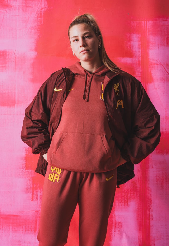 Höbinger, who casts such a different aura in the room compared to the hulking figures of Van Dijk, Gakpo and Quansah, sits attentively, naturally opting to perch on my right where the men sat on my left. “Yeah, I feel like I can be completely myself when it comes to my style and the clothes I wear and put on,” she says. “I feel like it reflects my personality as well and I really enjoy putting different fits together. I always like to be comfy firstly, but then look good as well. It's important to be able to show yourself in what you wear.”
