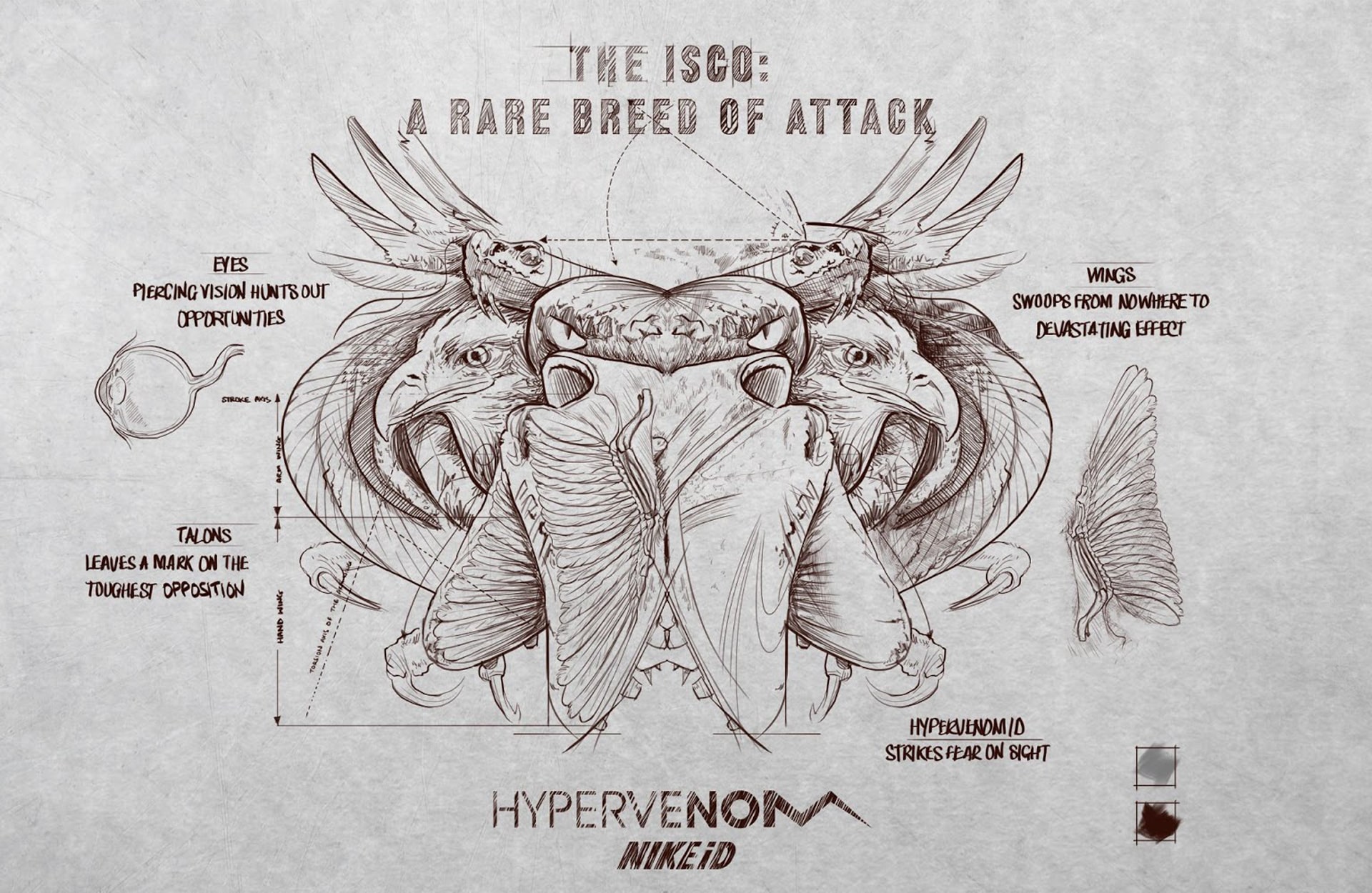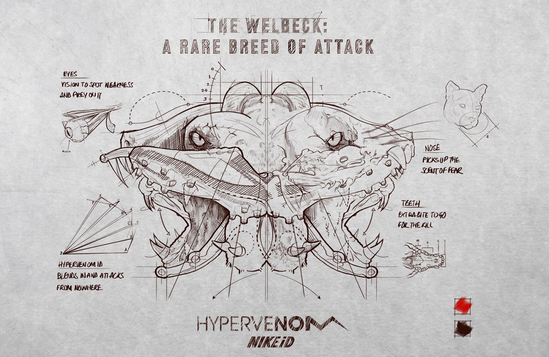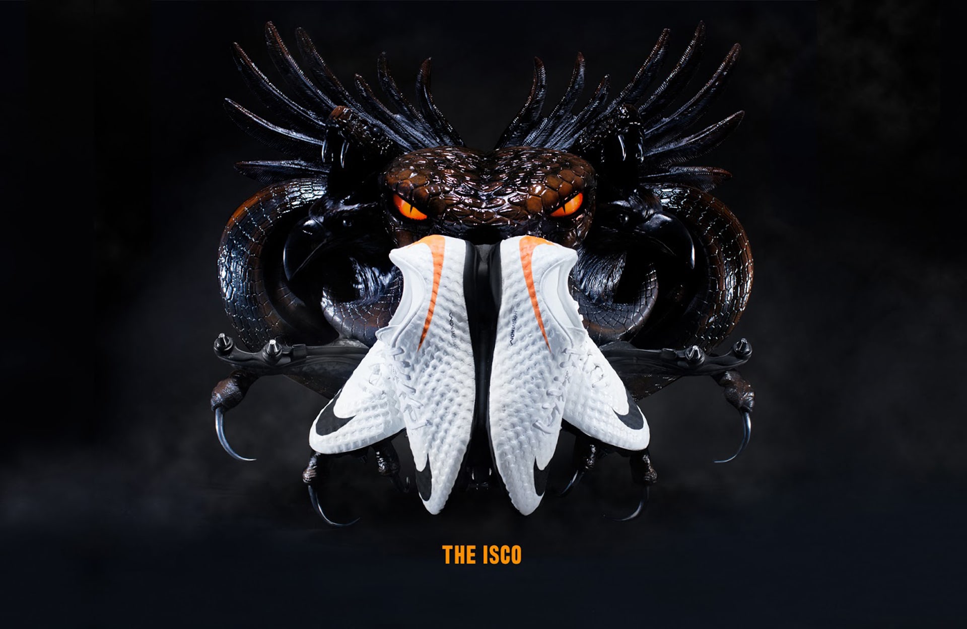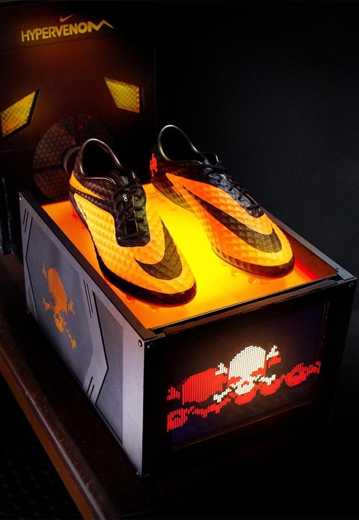 That trademark launch colourway, with the orange taken from Nike’s shoeboxes, was a strong statement. The Swoosh on the Hypervenom was taken from the Mercurial and flip-reversed to the instep to give the silo a familiar yet twisted aesthetic that players immediately related to, while remaining fresh.