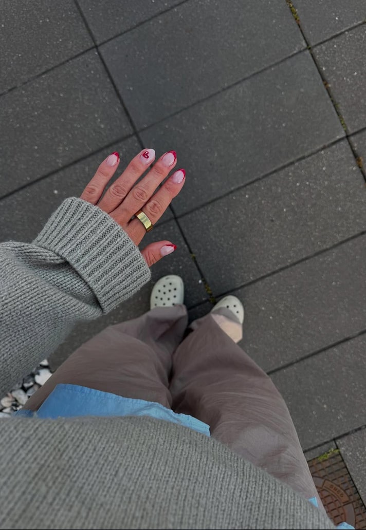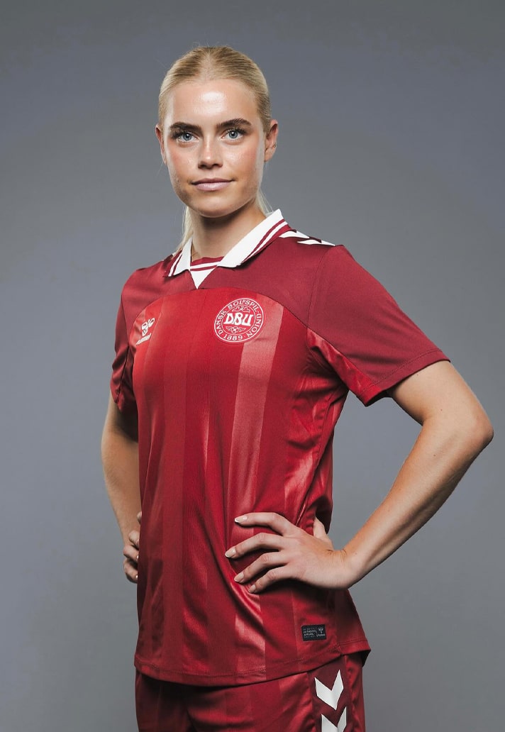 “For me, it’s like I’m doing something for myself, it’s a type of self-care. It just feels good to go on that pitch with fresh nails. We are all wearing the same kit, and this is a way of choosing something for myself”, says Signe Bruun about why she almost always plays with (red) painted nails. We meet her at the training camp for the Danish national team. Denmark is a staple at the EUROs, participating for the 11th time with their personal best being silver in 2017. This year, they have their work cut out for them in group C, where they’ll be going up against titans Germany and Sweden and possible surprise Poland. Bruun, who luckily can’t help but score — this season, she tied for fifth with Ballon D’or winner Aitana Bonmati on the Liga F top scorer rankings, and she has netted for Denmark 24 times in 52 matches — shows up for the interview with a fresh set of bright coral gels.