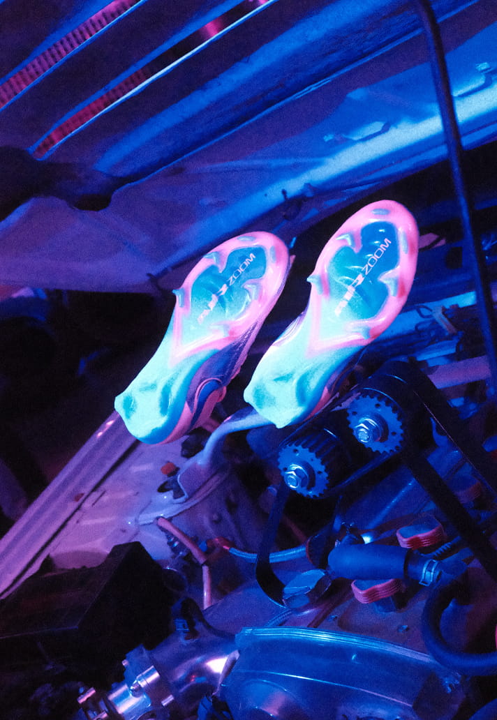 But onto the event. Hidden in the shadows of Madrid's concrete outer layer lay an underworld the city was never meant to see. The venue looked more like an underground car meet somewhere between Shibuya and São Gonçalo than a product launch. Black walls. Pink haze. Neon lights slicing through the darkness of the Madrid night. Everything bathed in the same colour palette as the boot itself and replicating its electric personality.
