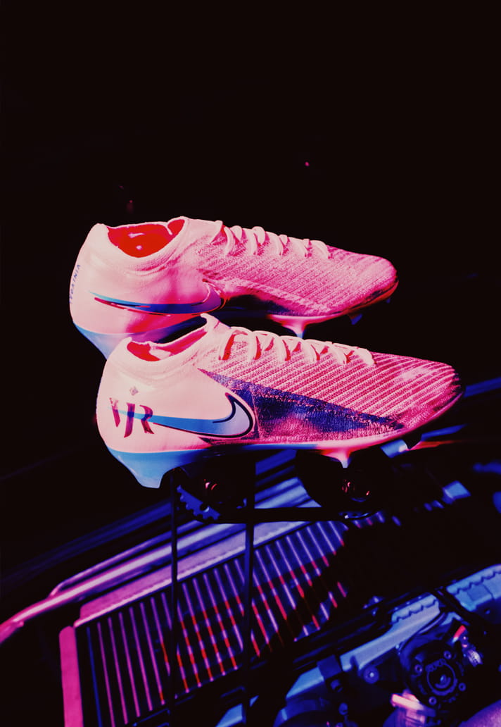 At the centre of all of this is the boot itself. A searing pink Nike Mercurial glowing under ultraviolet lights like it had been stolen straight from a neon skyline. It looks fast just standing still. The upper shimmered with iridescent textures and a crisp Swoosh slicing through the sides while Vini’s signature VJR is stamped amongst the heel. This was flare translated into a product.