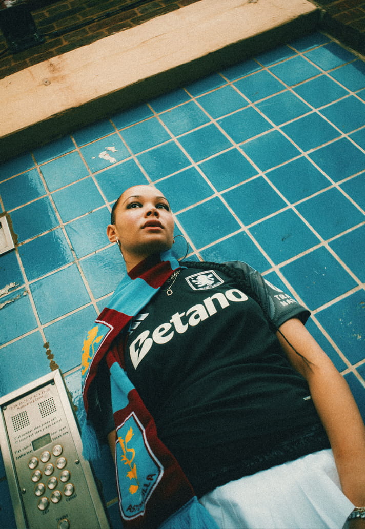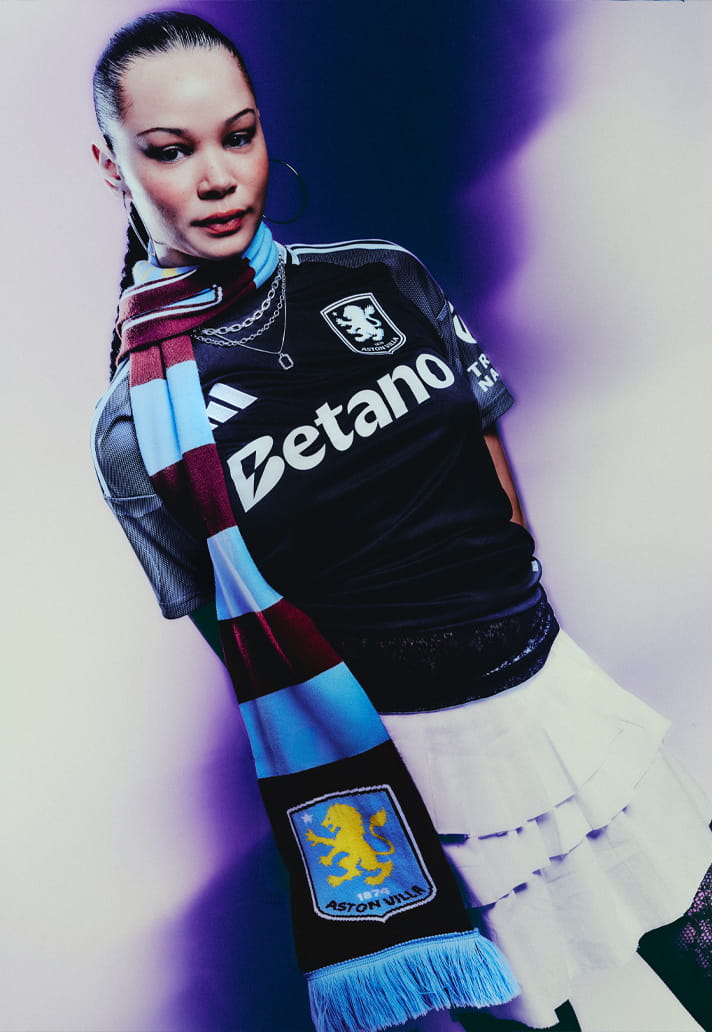 The base lands in deep black, but it’s not flat. There’s movement in the fabrication, subtle shifts in tone across the shoulders, a technical texture that gives the shirt depth without noise. The detailing… cool-toned blues across the upper panels: nods to club identity without overpowering the palette. It’s Villa, distilled.