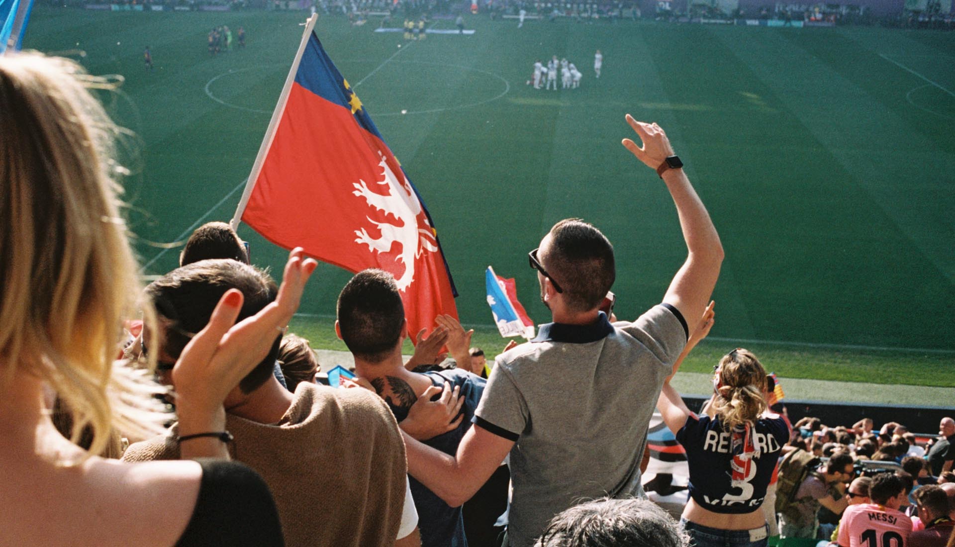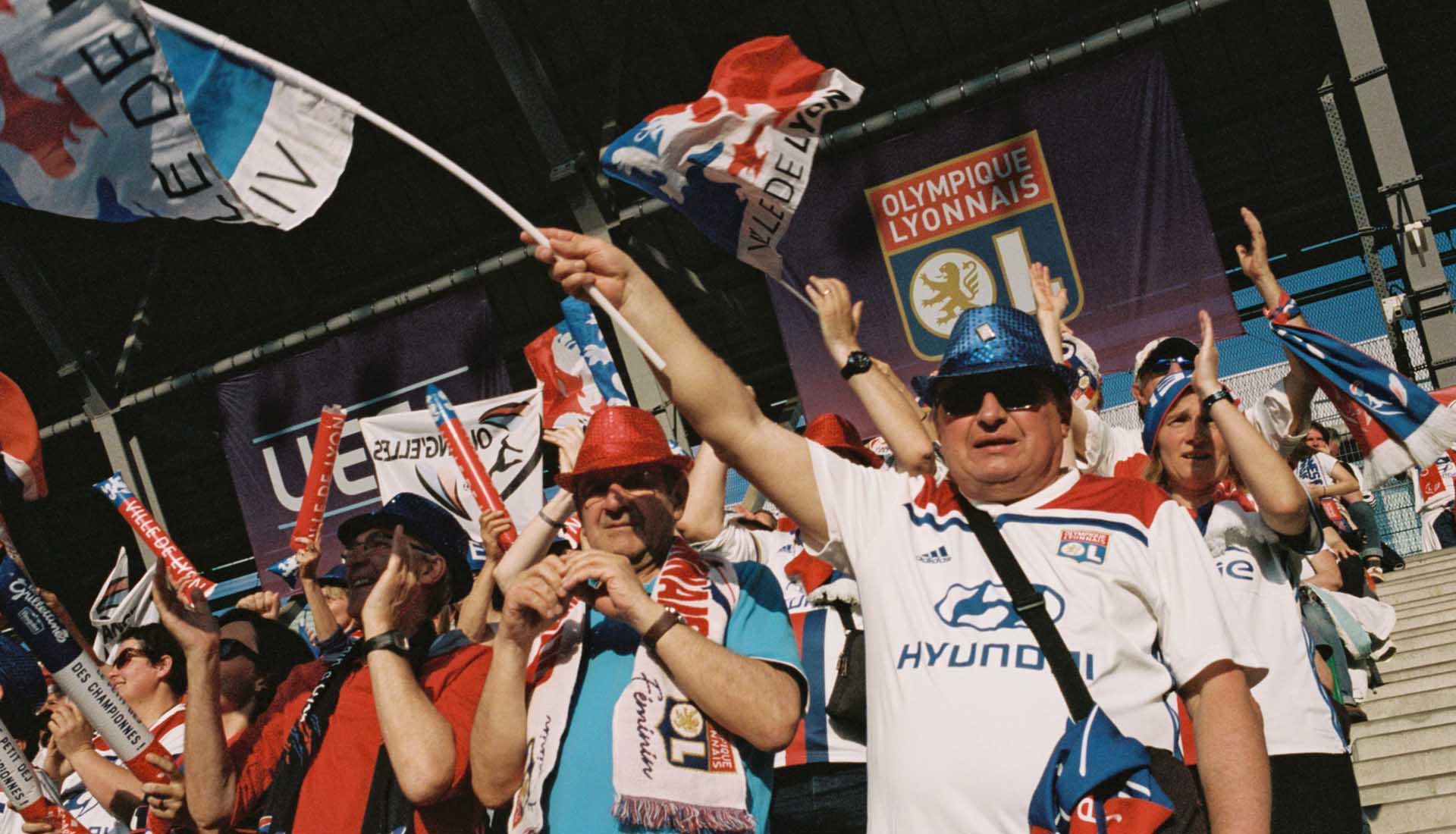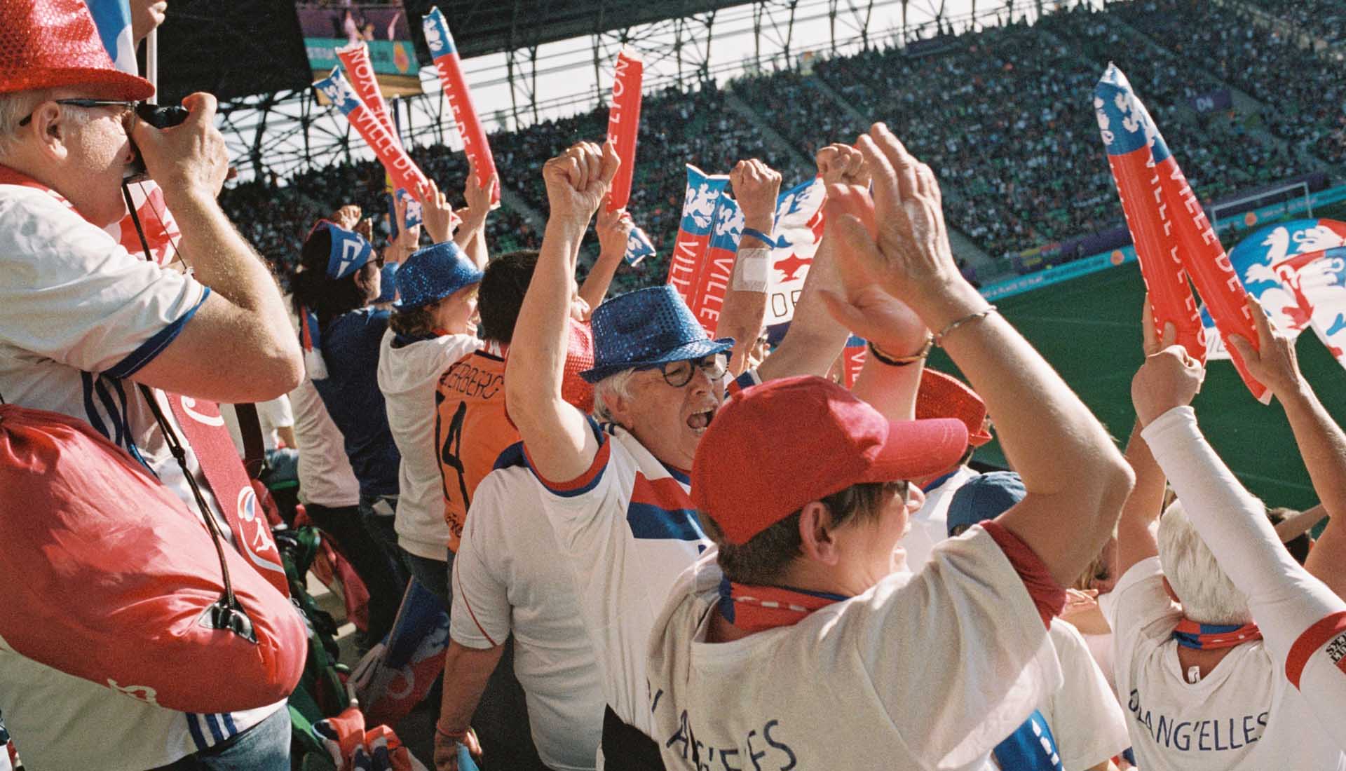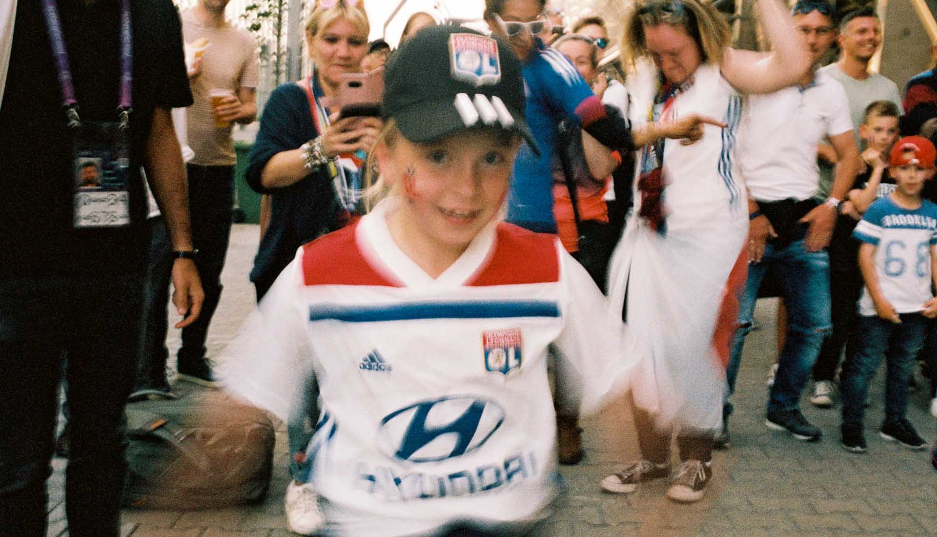 One image that really stands out for me is of a young girl in the stands with a Lyon flag around her neck. She’s looking just past the camera at the pitch, really immersed in what’s happening in the game. The evening sun is setting, so she and the people around her are soaked in a golden glow. There’s a man sitting next to her who I imagine to be her father. To me, she represents the moment that’s happening in women’s football right now – a time where young girls can see themselves reflected in the sport, who can attend a game that has the same level of excitement and anticipation as the male equivalent. It feels quite significant.