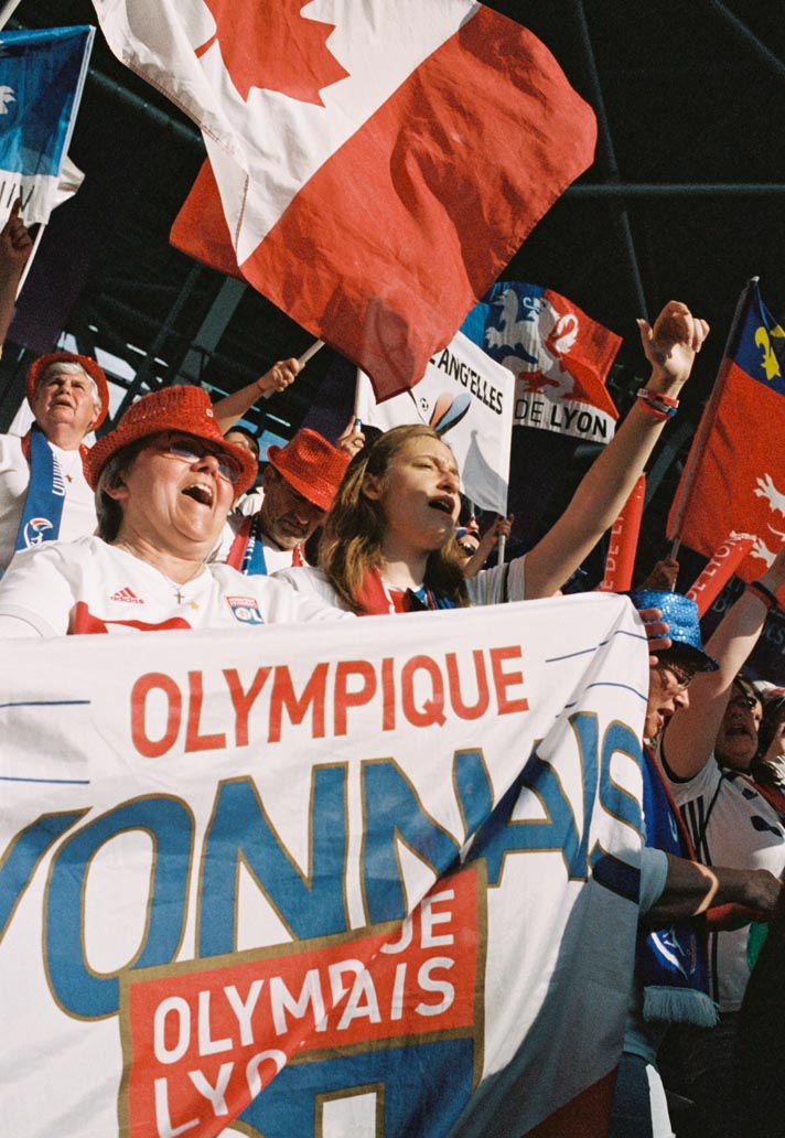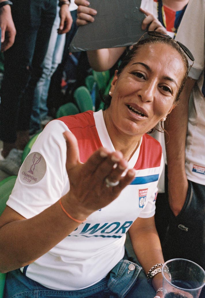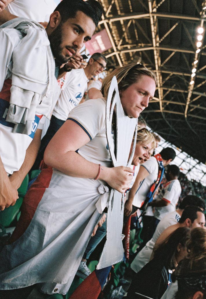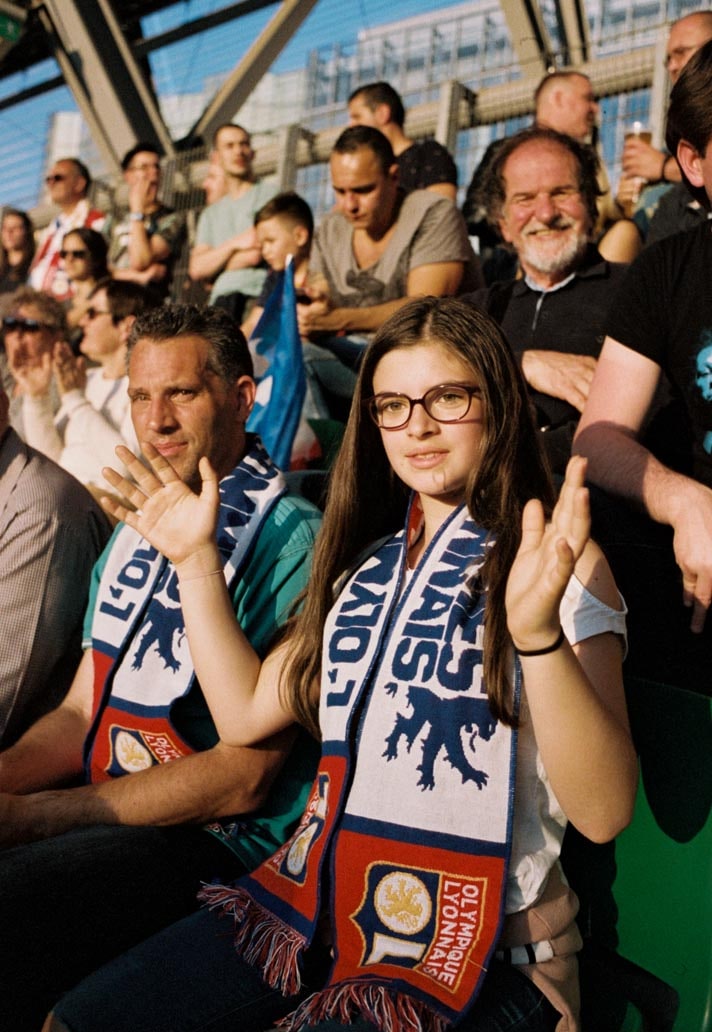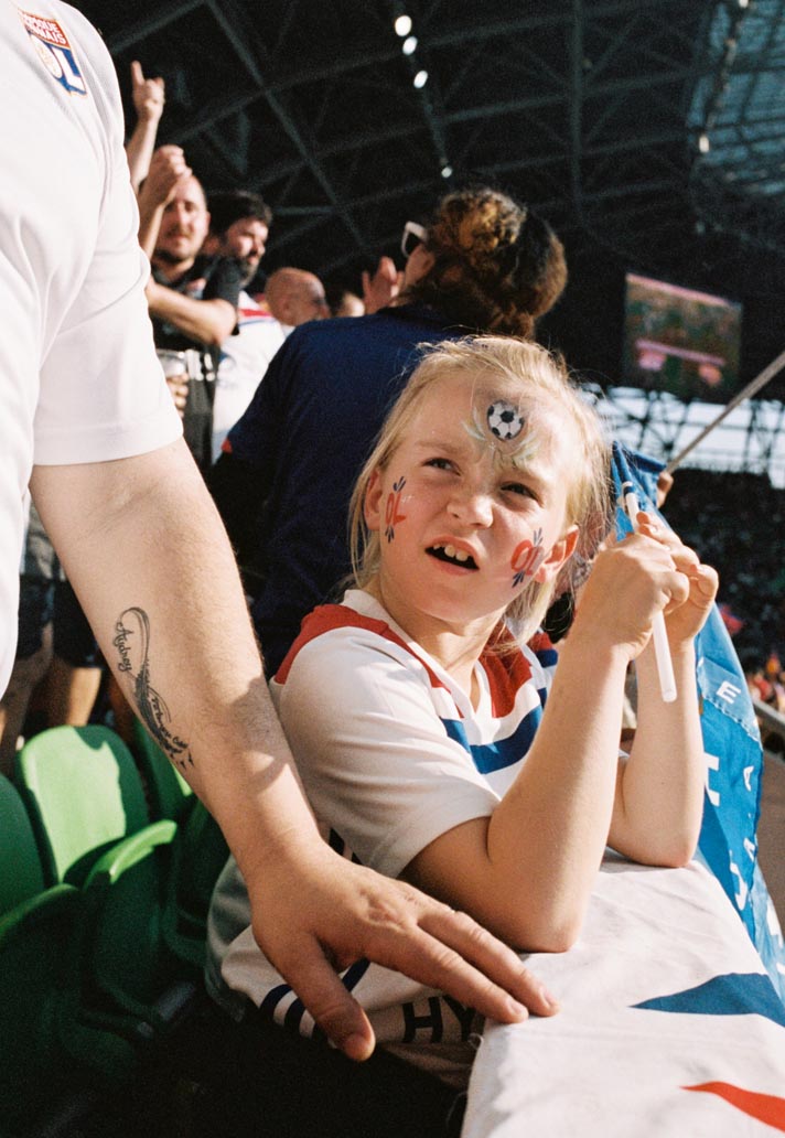 One image that really stands out for me is of a young girl in the stands with a Lyon flag around her neck. She’s looking just past the camera at the pitch, really immersed in what’s happening in the game. The evening sun is setting, so she and the people around her are soaked in a golden glow. There’s a man sitting next to her who I imagine to be her father. To me, she represents the moment that’s happening in women’s football right now – a time where young girls can see themselves reflected in the sport, who can attend a game that has the same level of excitement and anticipation as the male equivalent. It feels quite significant.