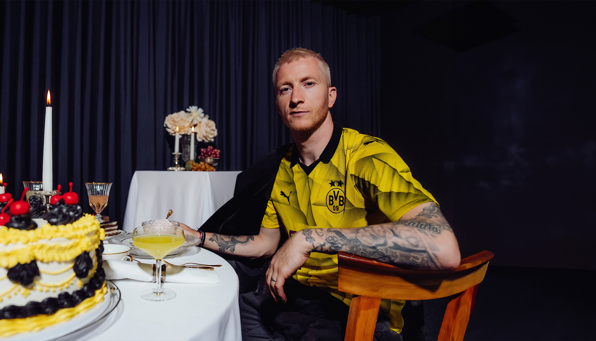 Arriving early on set in full kit fresh from training, Reus smiles when he sees the outlandish yellow and black dinner scene that SoccerBible has set up. Themed drinks ready to toast everyone who got him to this point and the BVB fans yet again, after publicly buying them a round of thank you pints. “I've grown up here, I came here as a child and have matured here, both as a person and as a player,” he stresses. “And yes, I'm just proud that I've managed to stay here for so long and I've met a lot of friends here, a lot of close friends. And it's just a great feeling that something like this is still possible in the business these days, so of course I enjoyed my time here.” Relaxed in a black suit and Puma sneakers with Borussia Dortmund’s 23/24 third jersey underneath, the 34-year-old has the chance to have his cake and eat it. That marvellous lemon creation is also an early birthday cake – Reus turns 35 today – and eventually wrecked by a football.
