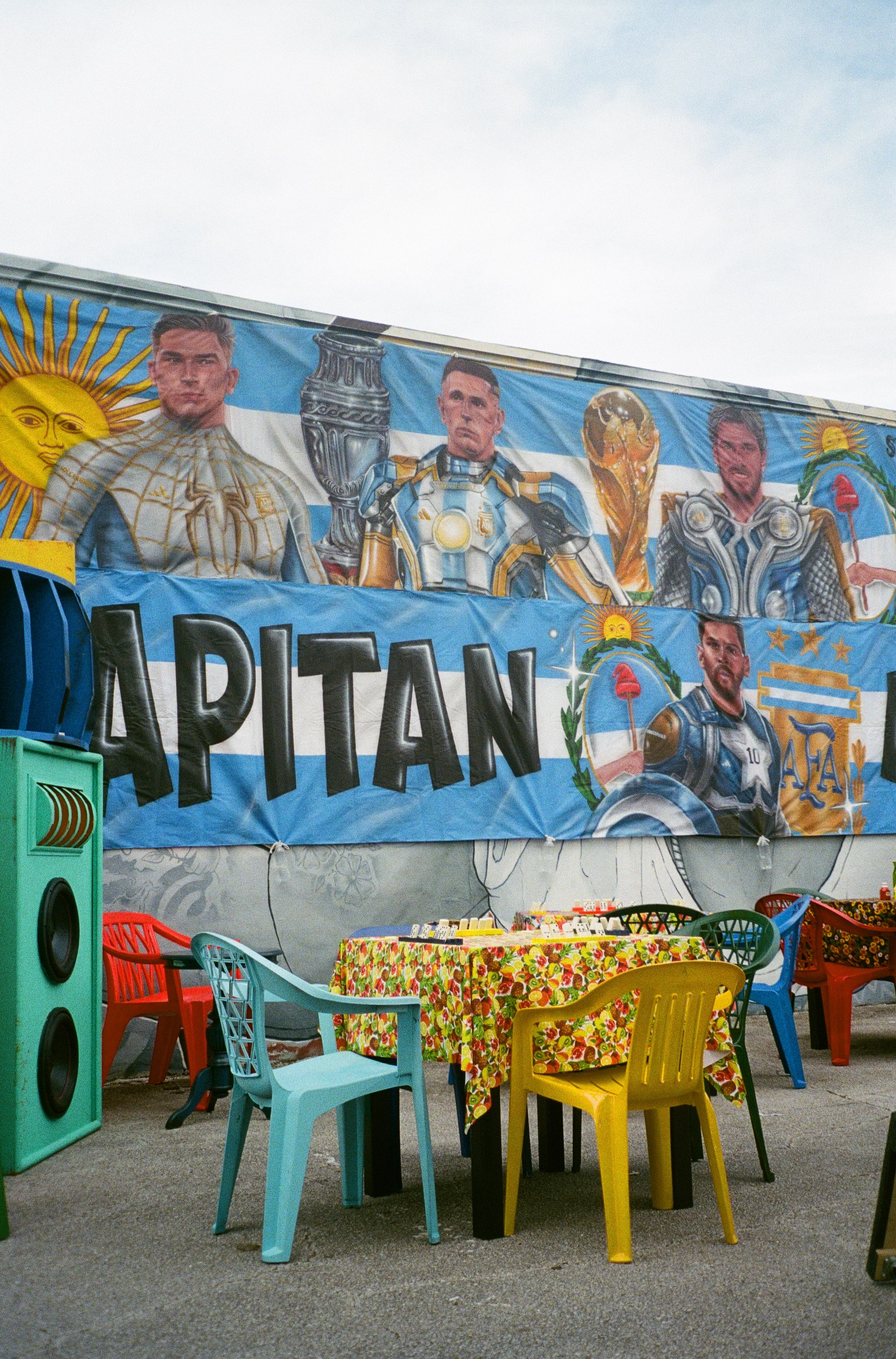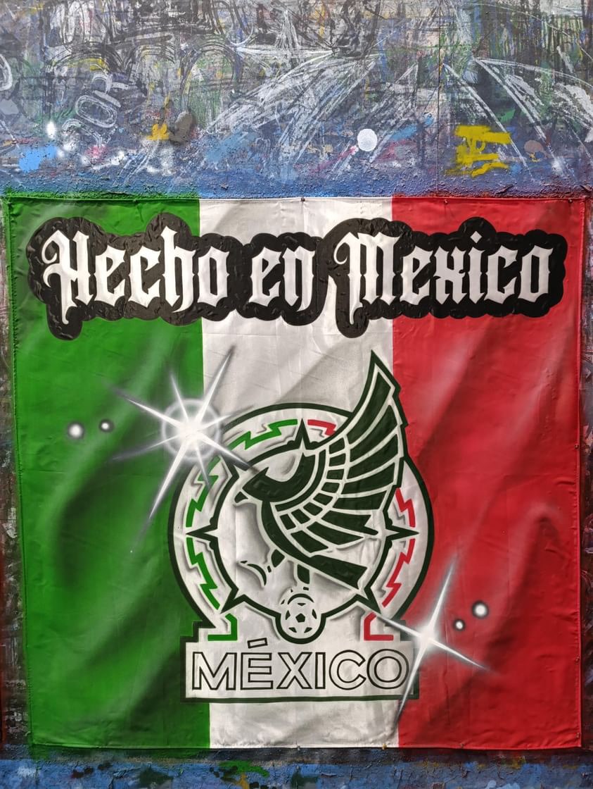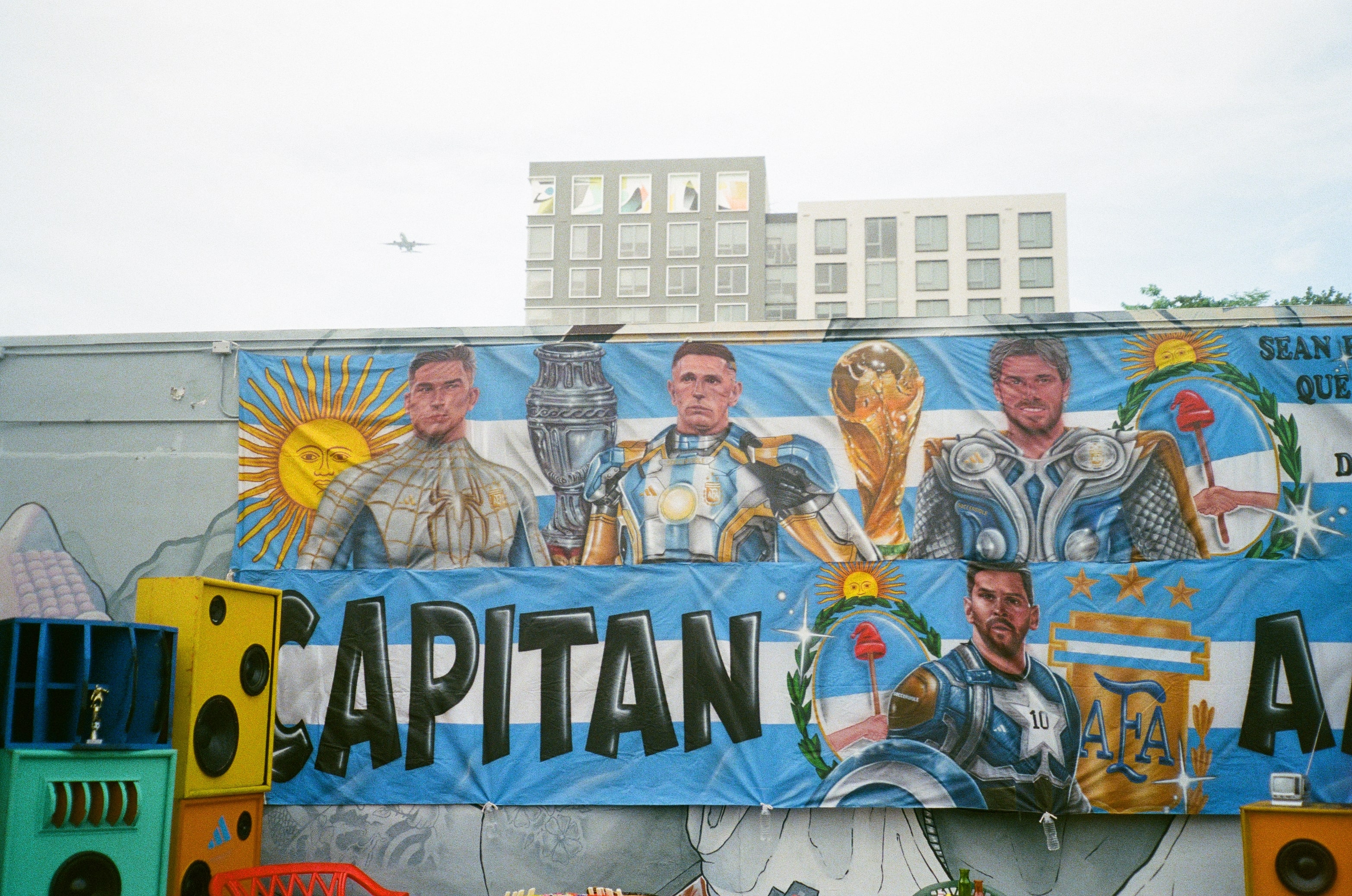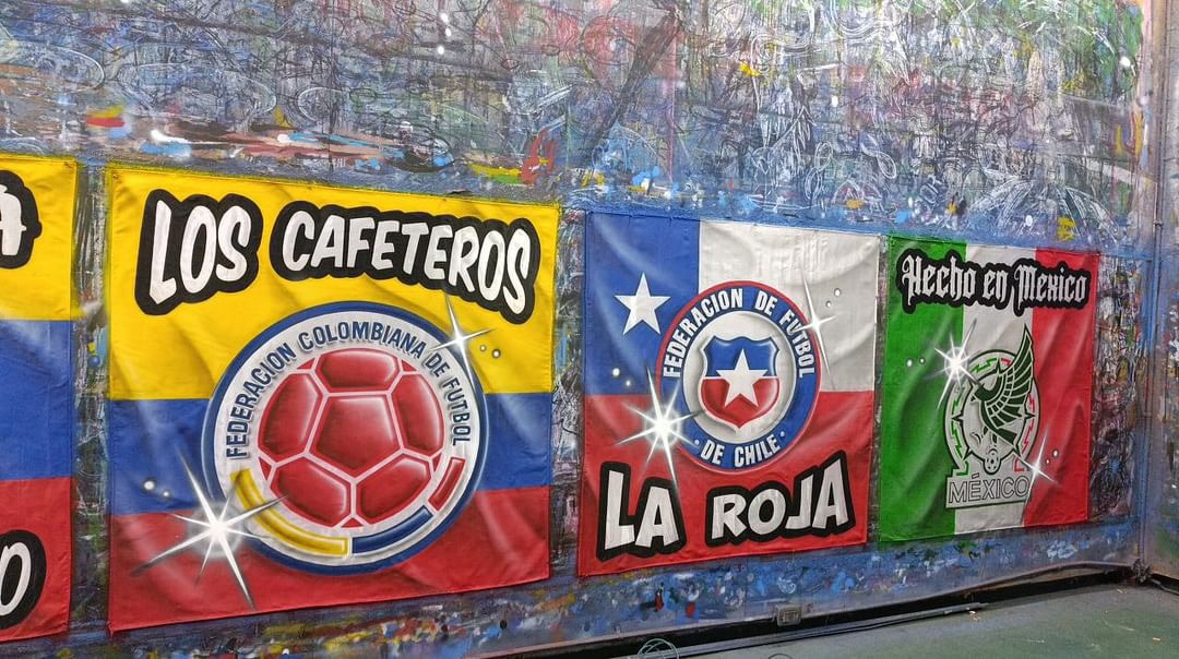 These tifos included a tribute to the Los Cafetaros of the Colombia team, and a Hecho en Mexico flag complete with the country’s tricolor. For Argentina, there was a superhero-style celebration of Lionel Messi as “Capitan America” to remind onlookers of his GOAT status and the country’s 2022 World Cup glory. The flags’ airbrushed style and signature sparkle motifs help them stand out and make them immediately recognisable as Perretta’s work.