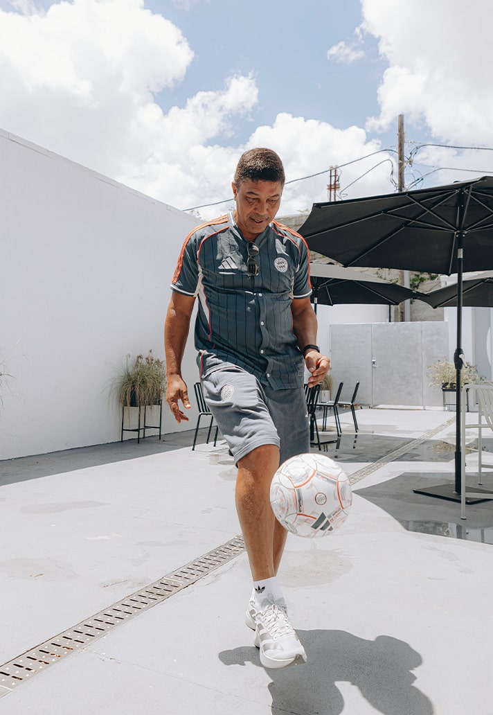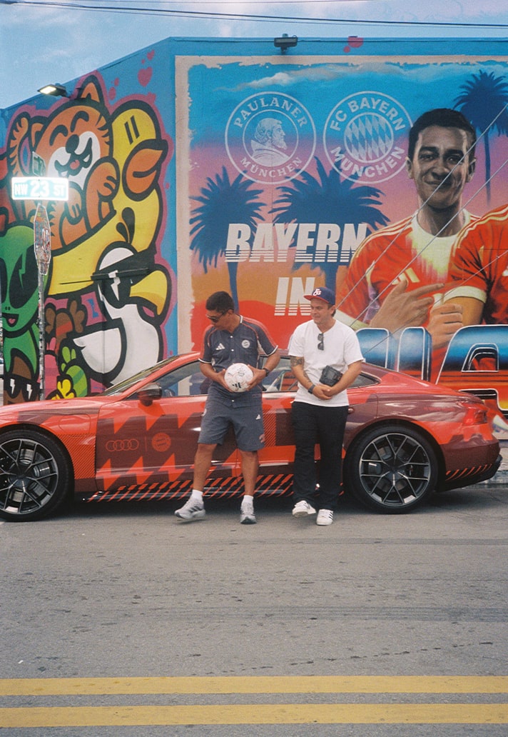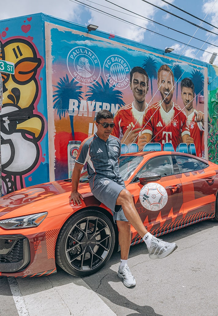 Framed by the high-energy buzz of the Club World Cup and rooted in the cultural fabric of Miami, we hit the streets with FC Bayern and Audi to explore the deeper threads of the game — where football meets lifestyle, and legacy rolls on four electric wheels. In the driver’s seat of an Audi RS e-tron GT Performance concept wrapped in Bayern DNA, Giovane Élber — a legend of both Brazil and Bavaria — showed us what it means to carry football with you everywhere, even long after the final whistle.