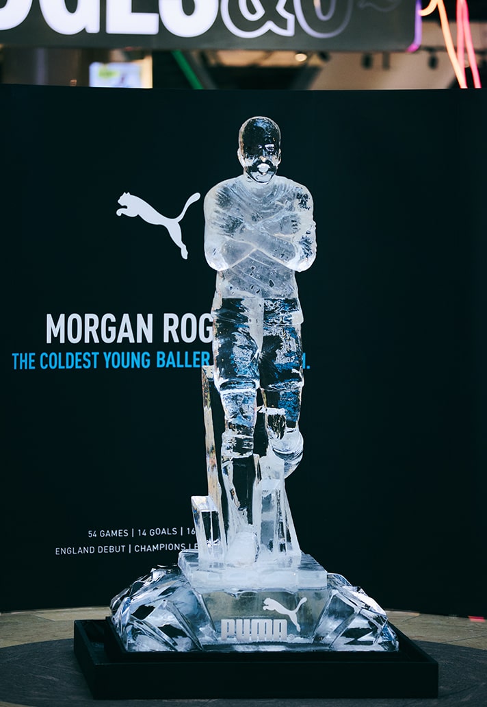 To mark Rogers' success, PUMA staged a striking tribute in the heart of Birmingham. Taking over the Bullring shopping mall, the brand unveiled a one-of-a-kind ice sculpture that immortalised Rogers’ now signature ‘cold’ celebration. This not only celebrated his breakout season in the Premier League but also highlighted PUMA’s connection to moments of individuality. The celebration that has become iconic during Roger’s rise now frozen in time.