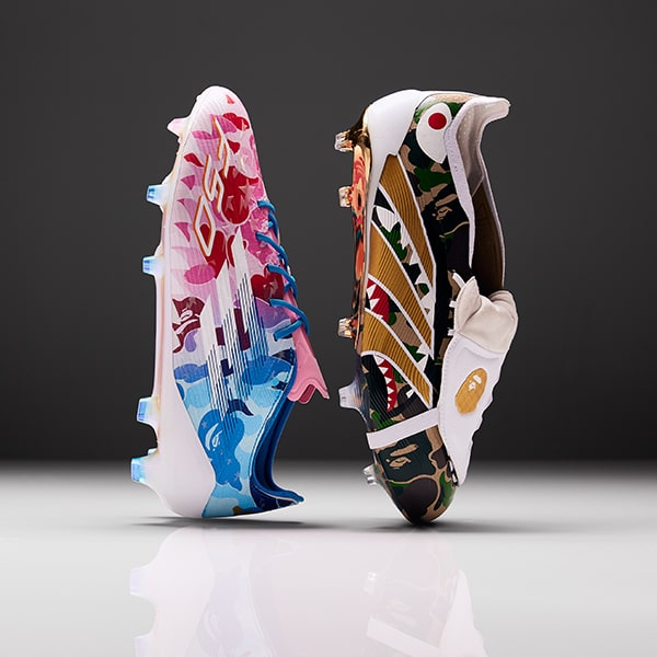 A trio of statement pieces make up the collection; a zip-up track jacket in red with white stripes hosts dual branding on either side if the chest, and a slick football jersey completes the clothing side with the adidas performance logo joined by "A Bathing Ape" motif where the traditional club crest would be. The rear of the shirt features the number 12 with BAPE's camo print and "A Bathing Ape" sits in place of a players name.