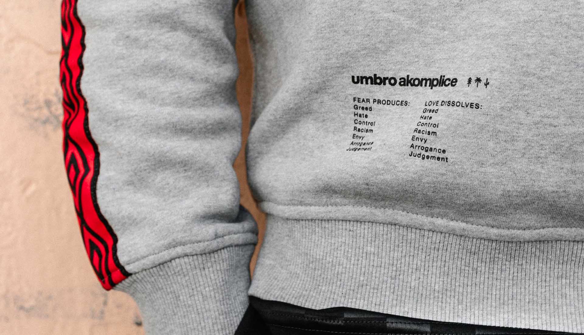 The Umbro x Akomplice SS18 collection features football jerseys and shorts, track jackets, sweatshirts, sweat pants and hoodies, all with an '80s design vibe. A running theme throughout the capsule is the use of positive words such as Love, Trust, and Compassion alongside crossed out negatives such as Fear, Hate, and Greed.